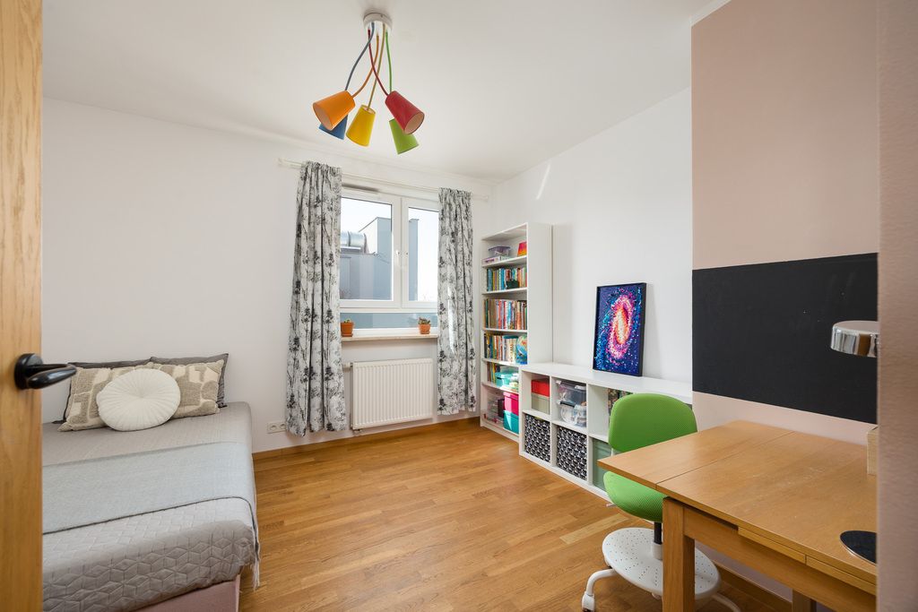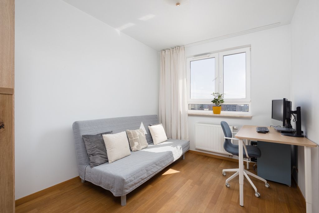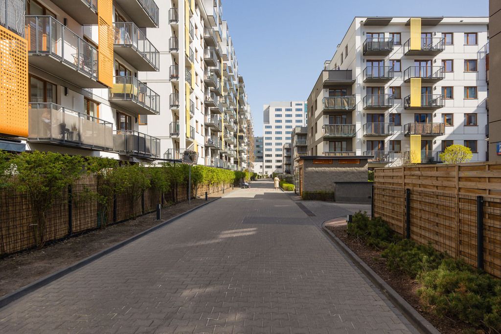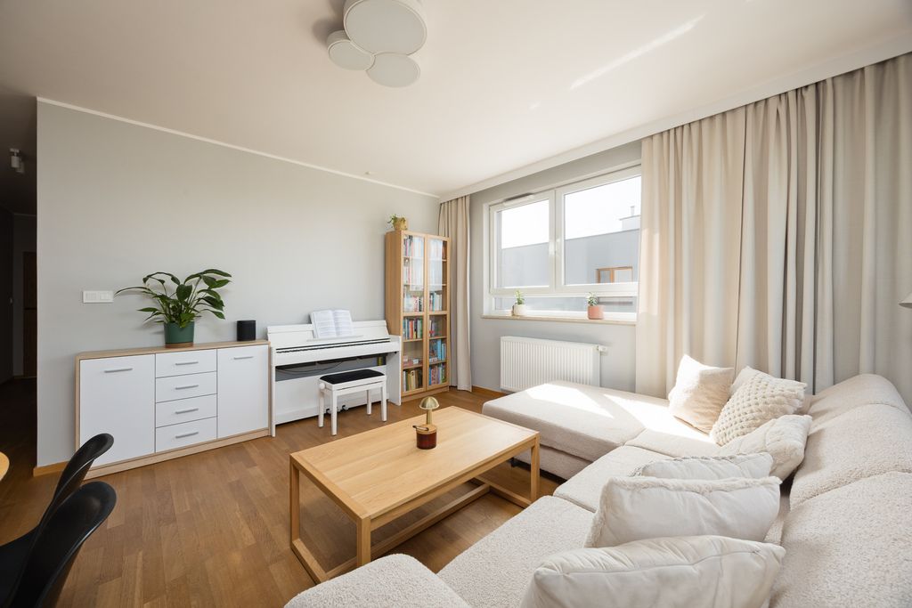 W mieszkaniu znajduje się drewniana podłoga Barlinek, a aneks kuchenny wyposażony jest m.in. w lodówkę, zmywarkę, piekarnik z funkcją pary, płytę indukcyjną oraz okap. W budynku dostępna jest wózkownia.