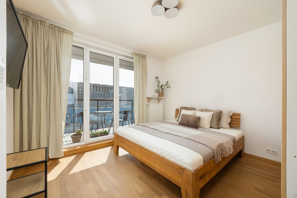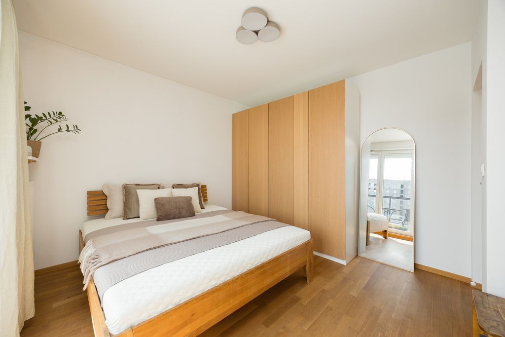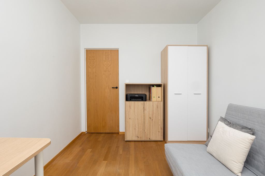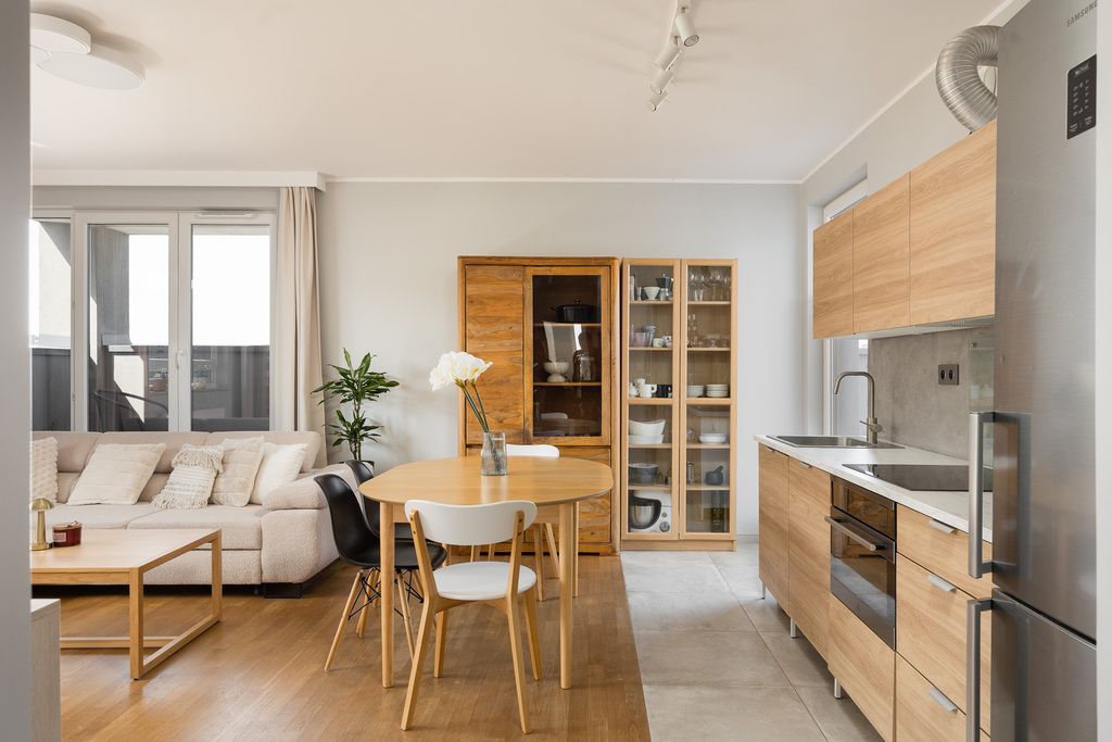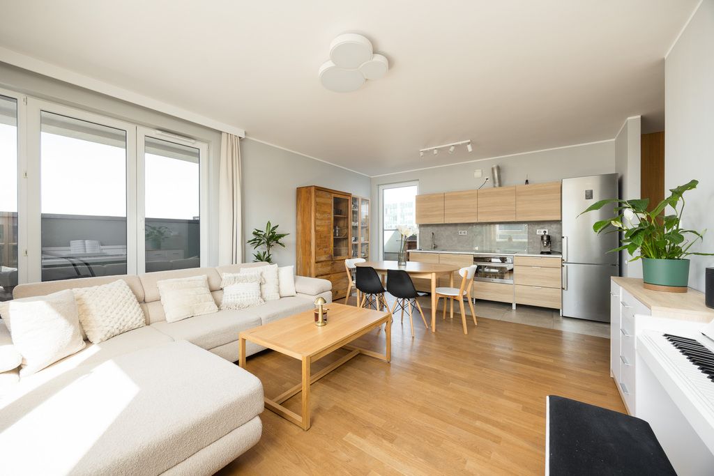 W mieszkaniu znajduje się drewniana podłoga Barlinek, a aneks kuchenny wyposażony jest m.in. w lodówkę, zmywarkę, piekarnik z funkcją pary, płytę indukcyjną oraz okap. W budynku dostępna jest wózkownia.