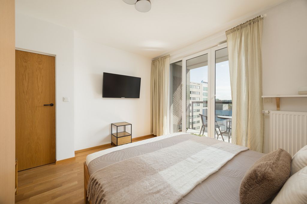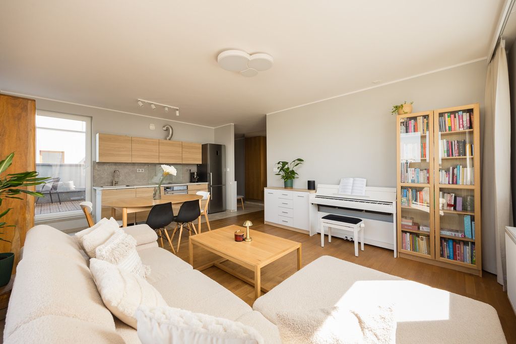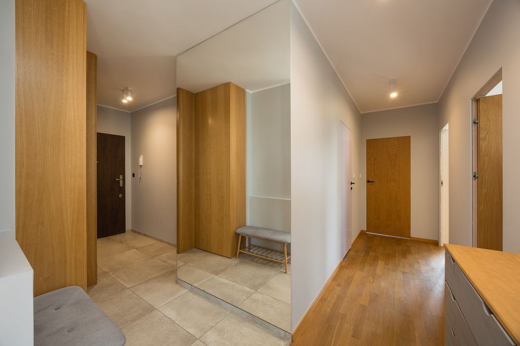 Mieszkanie znajduje się na ostatnim piętrze budynku, co zapewnia poczucie prywatności, brak sąsiadów nad lokalem oraz bardzo atrakcyjny widok na okolicę. Lokal jest trójstronny, z ekspozycją okien na wschód, zachód i południe, dzięki czemu wnętrza są bardzo dobrze doświetlone. Układ pomieszczeń jest bardzo funkcjonalny i pozwala na wygodne wydzielenie części dziennej oraz prywatnej.