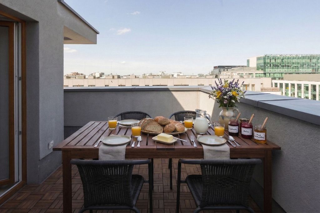 Czteropokojowe mieszkanie z tarasem na warszawskim Mokotowie położone na dziewiątym (ostatnim) piętrze budynku z 2016 roku przy ul. Cybernetyki 2B.