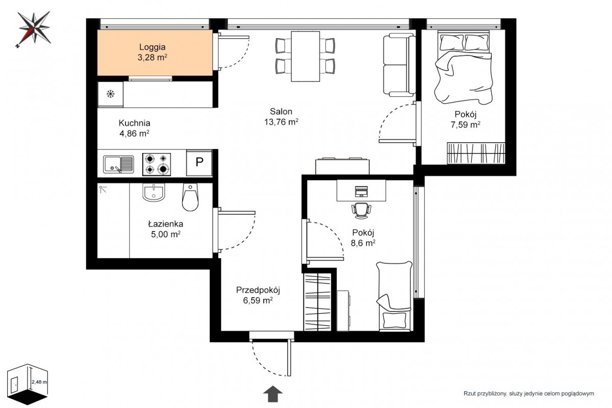 - serce mieszkania, czyli ustawny, dobrze doświetlony i przejściowy salon o pow. ok. 13,76 mkw, z którego prowadzi wyjście na balkon typu loggia o pow. ok. 3,28 mkw,