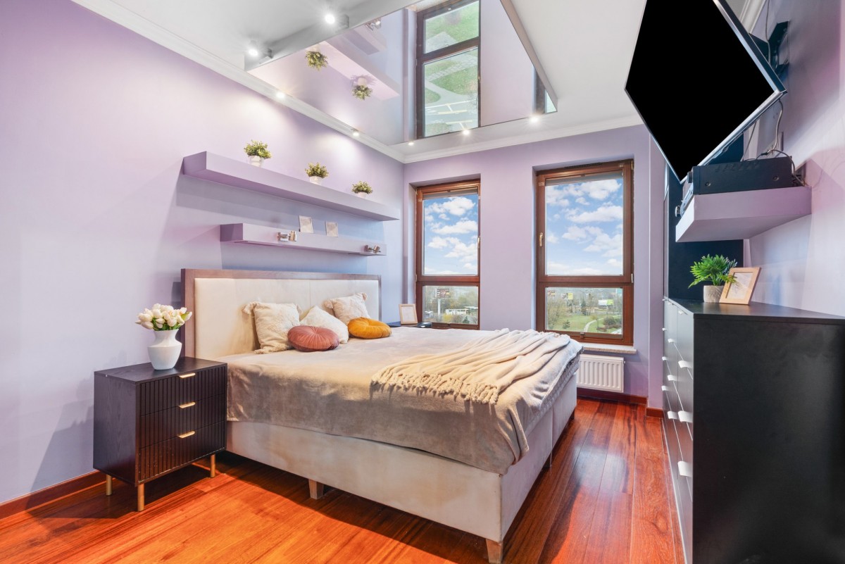 Sypialnia główna z dużym łóżkiem typu king size (2x2 m) i przestronną szafą w zabudowie.