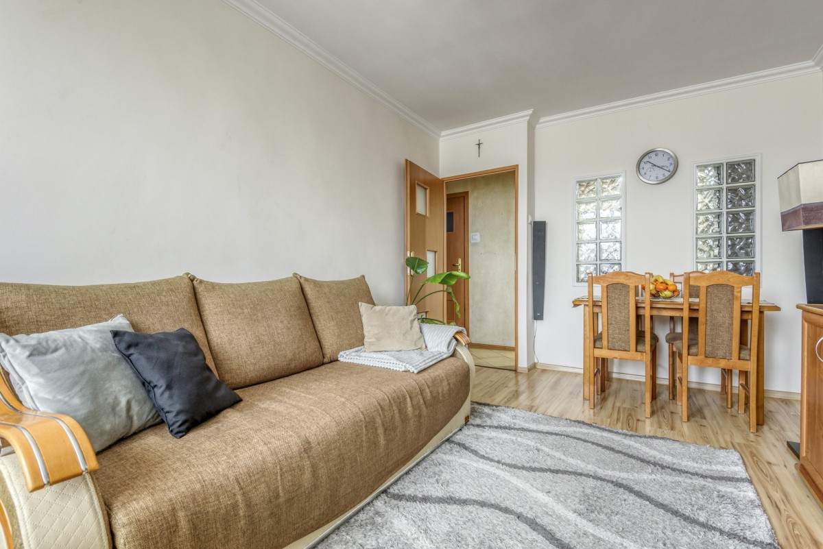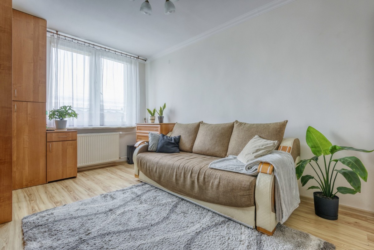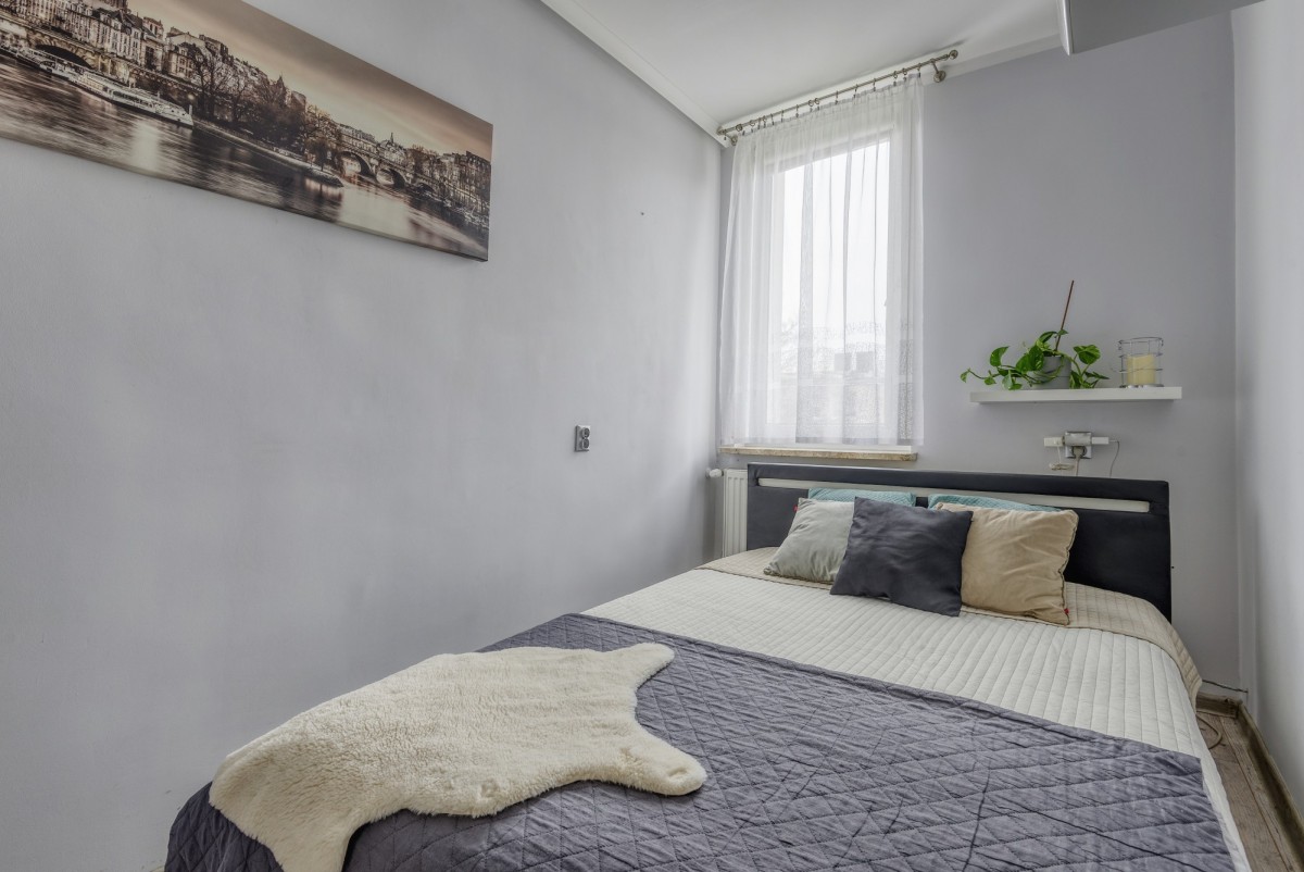 Przedmiotem oferty jest przytulne mieszkanie o powierzchni 35,24 m², położone na czwartym piętrze budynku bez windy. Lokal składa się z dwóch pokoi, w tym osobnej sypialni (9 m2), oraz przestrzeni dziennej (15,5 m2) z aktualnie wydzieloną kuchnią (4,5 m2) pozbawioną okna. Istnieje możliwość połączenia salonu z kuchnią, co pozwoli stworzyć bardziej otwartą i funkcjonalną przestrzeń. W kuchni oraz łazience (3 m2) została wykonana nowa instalacja elektryczna. Mieszkanie jest ciche, a jego okna wychodzą na południowy wschód, zapewniając dobre doświetlenie wnętrz przez większą część dnia. Do każdego pomieszczenia wchodzi się z korytarza (3 m2). Przy czterech osobach miesięczny czynsz wynosi około 700 zł.