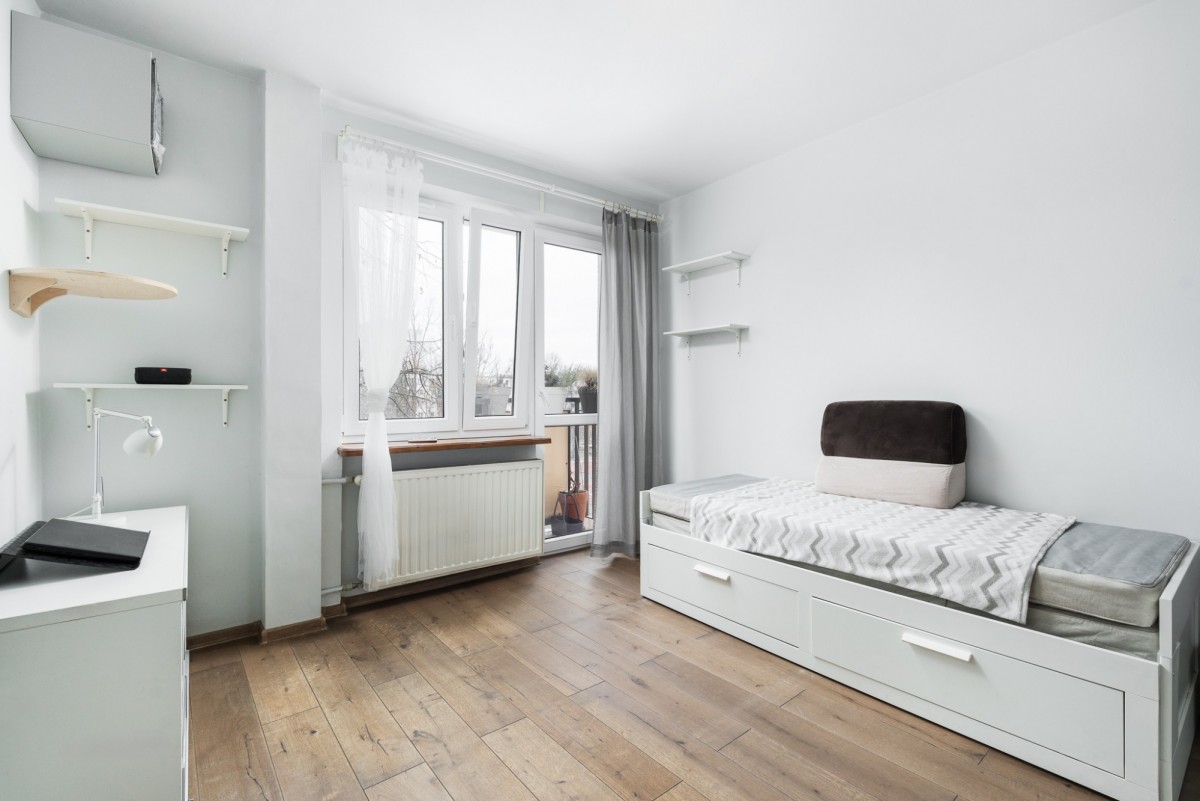 Z pokoju wyjście na balkon, z którego rozciąga się widok na zieleń. Okna skierowane są na stronę zachodnią.