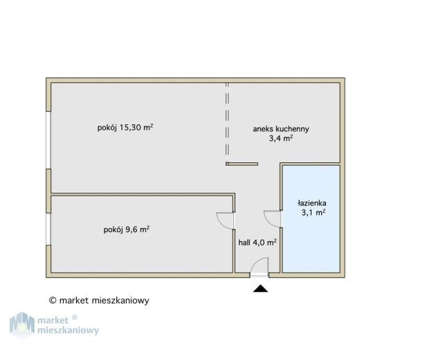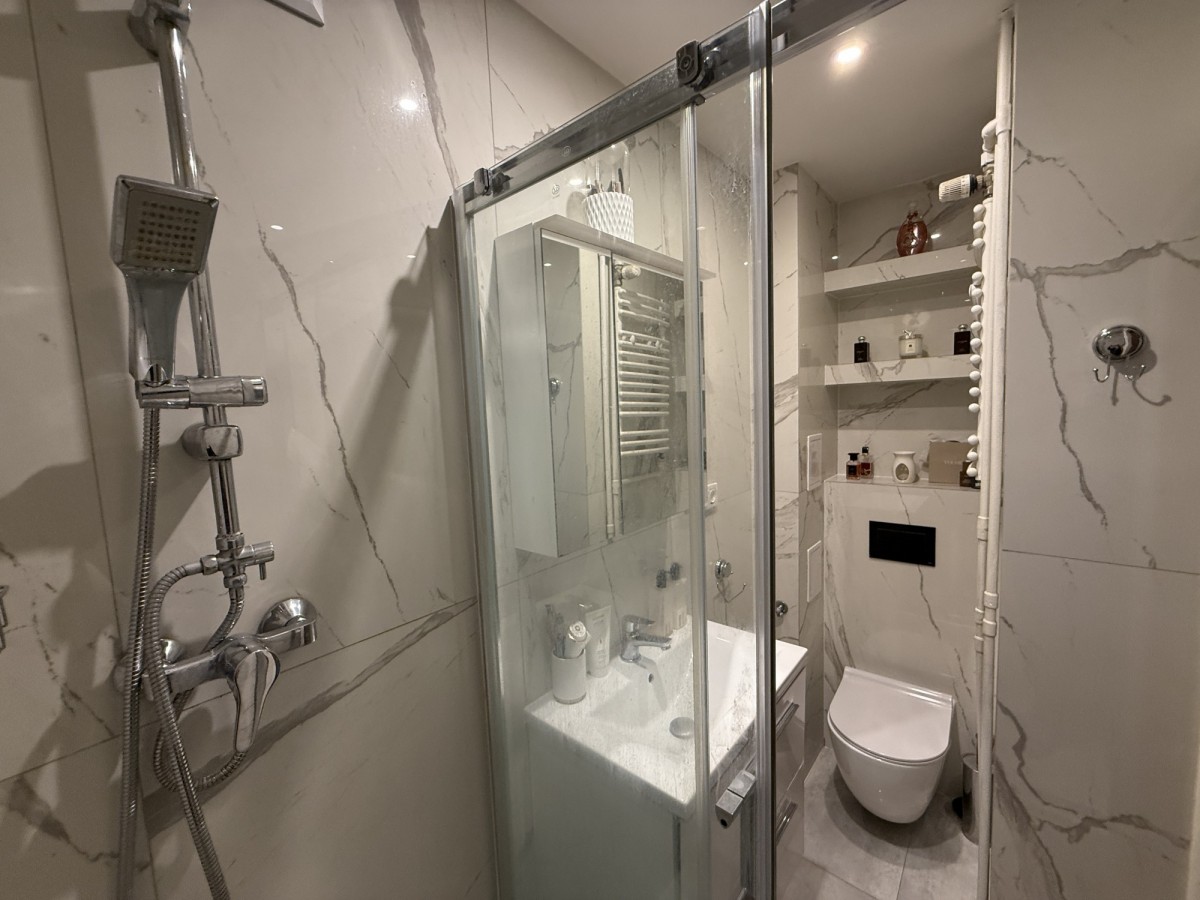 2 pokoje: przestronny pokój dzienny z aneksem kuchennym oraz sypialnia, w której obecnie jest bardzo funkcjonalna garderoba. Łazienka z nowoczesnym prysznicem. Przedpokój z praktyczną zabudowaną szafą.