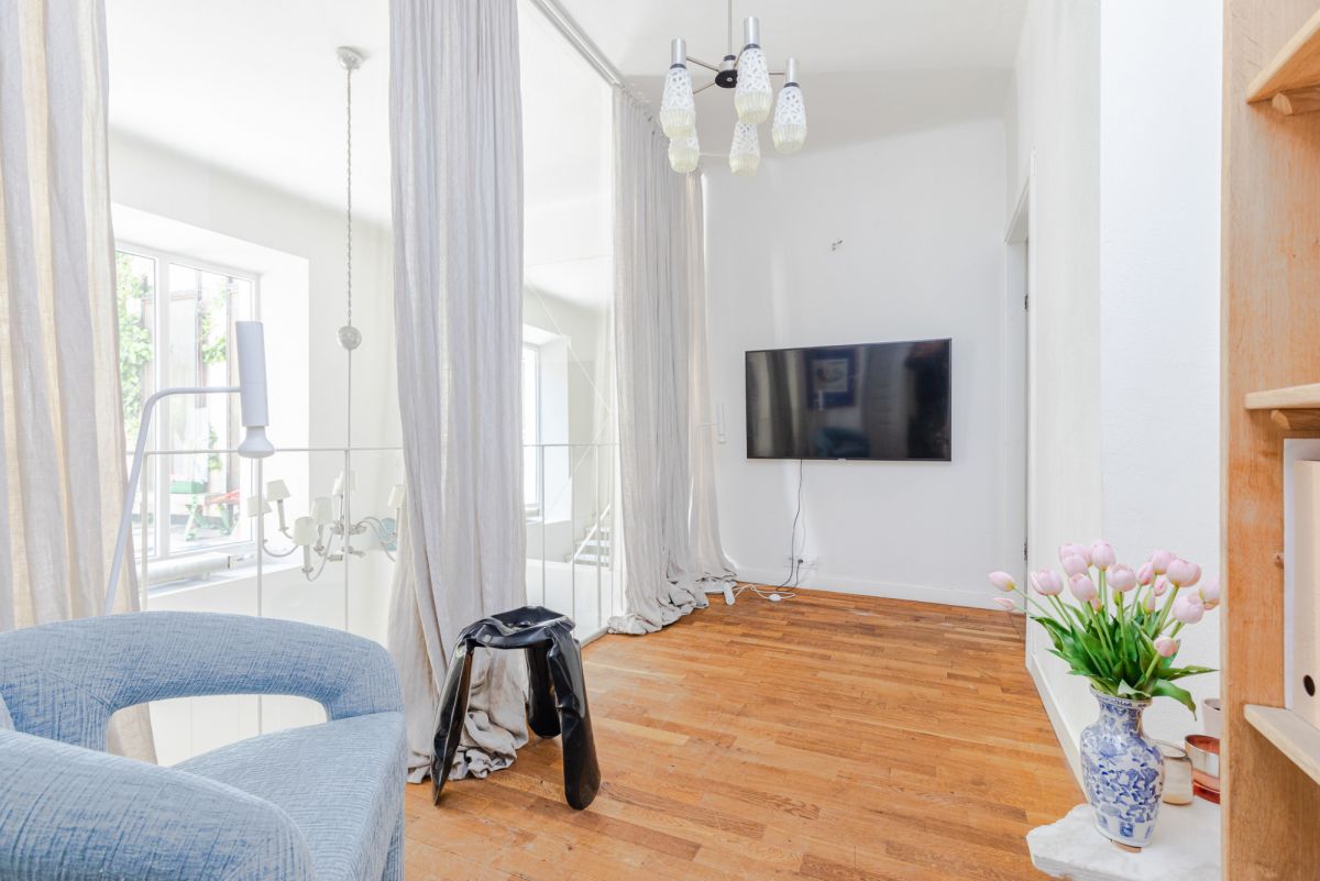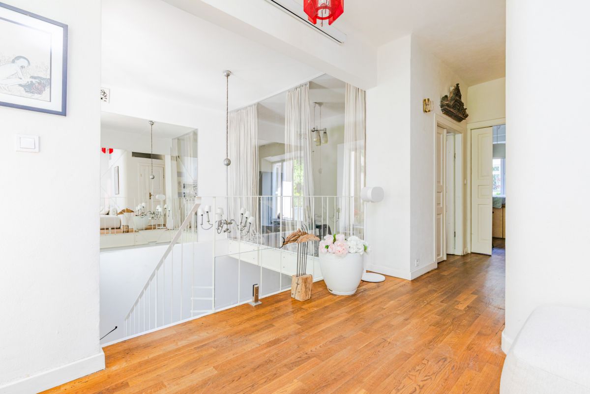 Wysokie wnętrza w mieszkaniu na ponad 3 m oraz jadalnia o wysokości 6 metrów robią spektakularne wrażenie. Tynki fakturowe ręcznie robione przez rzeźbiarza, piękna dębowa podłoga, marmur w łazience oraz na tarasie to tylko niektóre smaczki tej perełki.