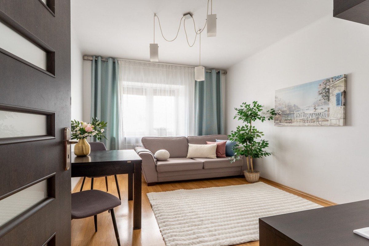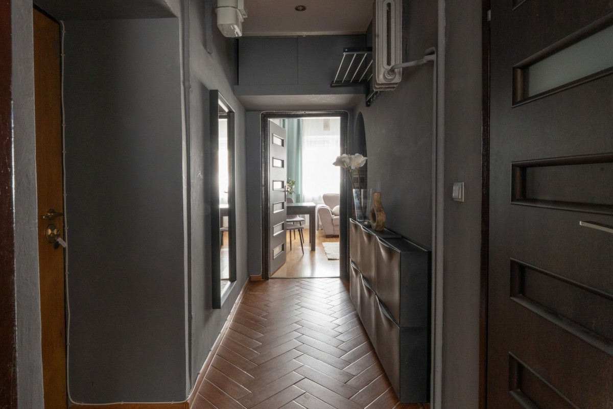 Mieszkanie jest w pełni umeblowane i wyposażone w sprzęt AGD, dlatego też od ręki można się tu wprowadzić bądź zacząć zarabiać na wynajmie. Bardziej wymagający klienci mogą rozważyć odświeżenie według własnych potrzeb. Budynek jest dobrze utrzymany, niedawno była wymieniona winda. Teren posesji jest zamknięty i zabezpieczony domofonem, a do wyłącznej dyspozycji mieszkańców pozostaje podwórze z ławkami.