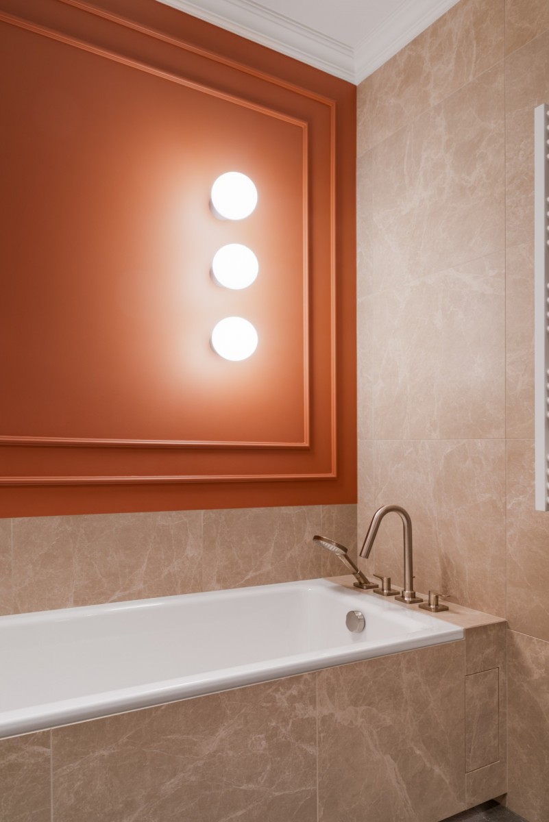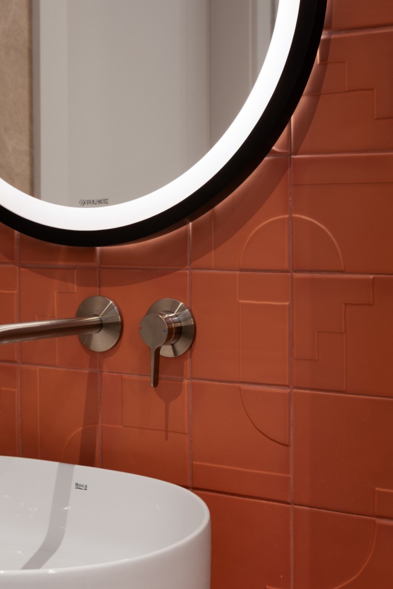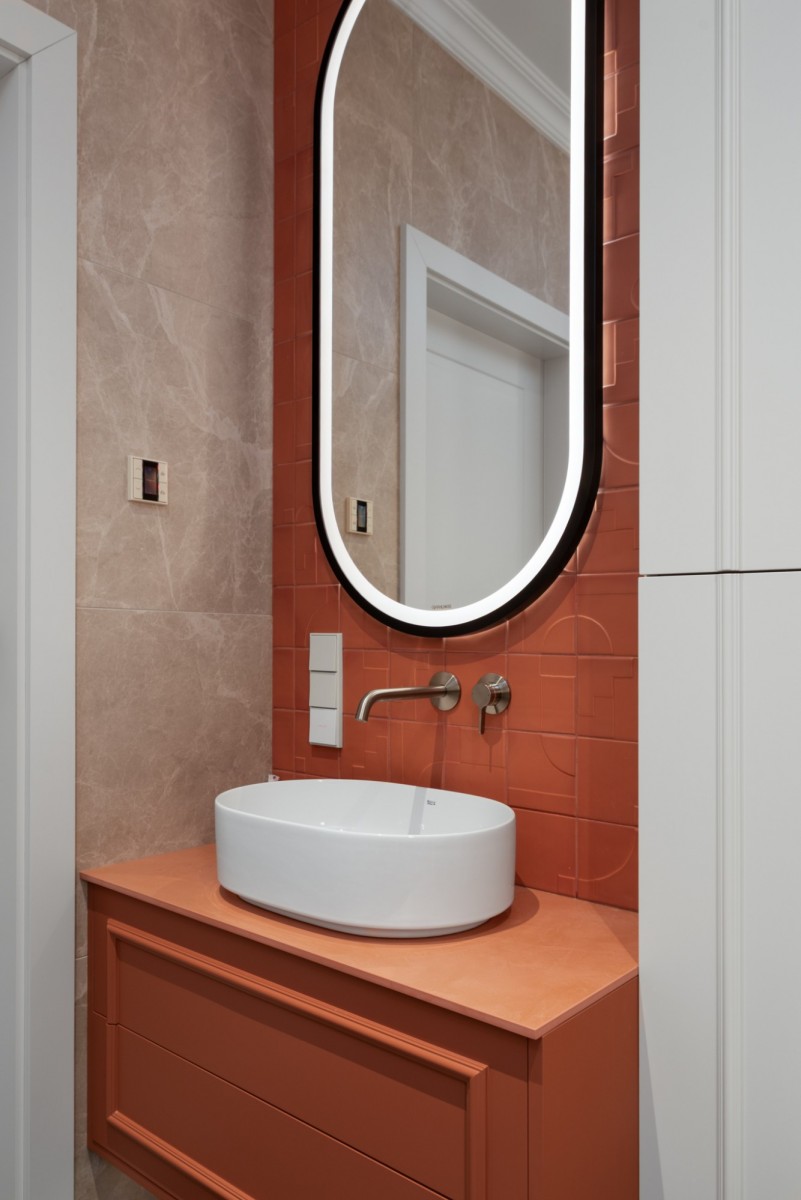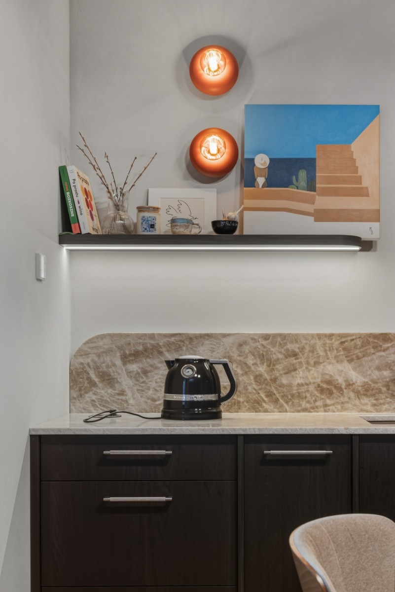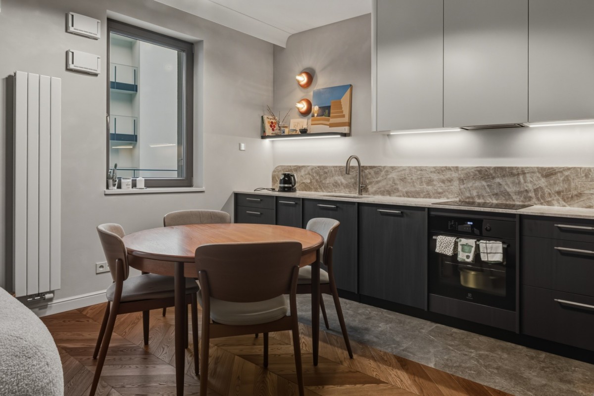 W mieszkaniu zastosowano m.in.: szlachetne okładziny, spieki, rozwiązania stolarskie wykonywane na zamówienie, designerskie oświetlenie oraz wysokiej klasy podłogi. Całość utrzymana jest w spójnej, współczesnej estetyce Portu Praskiego.