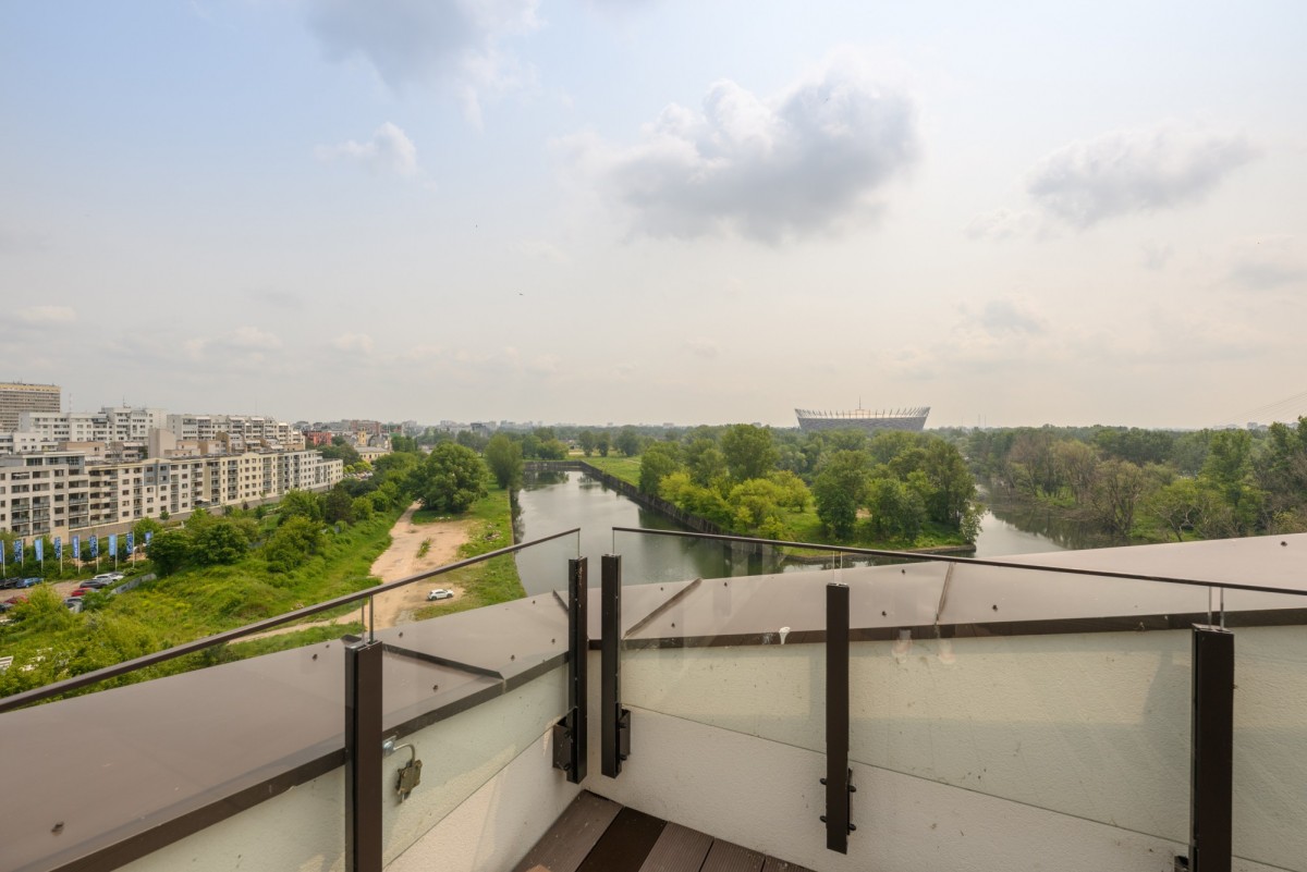 Taras 30 m² na dachu z panoramicznym widokiem na panoramę miasta, na Wisłę i na Stadion Narodowy