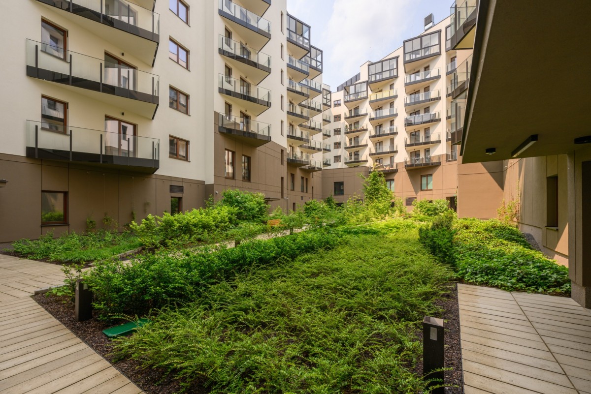 Eleganckie części wspólne, lobby z recepcją, windy z bezpośrednim zjazdem do hali garażowej oraz system kontroli dostępu zapewniają komfort i bezpieczeństwo mieszkańców.