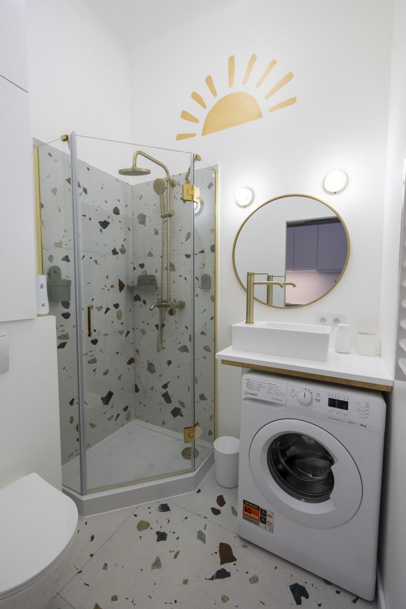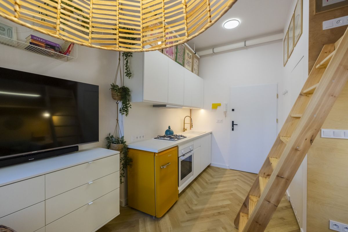 Mieszkanie po generalnym remoncie z wykorzystaniem przemyślanych rozwiązań optymalizujących przestrzeń. Kawalerka znajduje się na 4 piętrze z 5 w budynku bez windy.