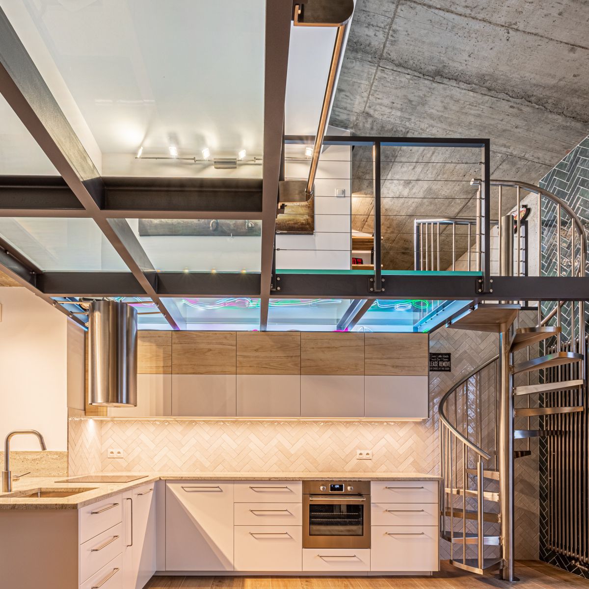 Schodami ze stali nierdzewnej dostajemy się na górny poziom w którym podłoga została stworzona z tafli pancernego szkła.
