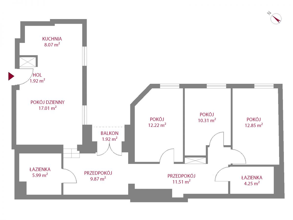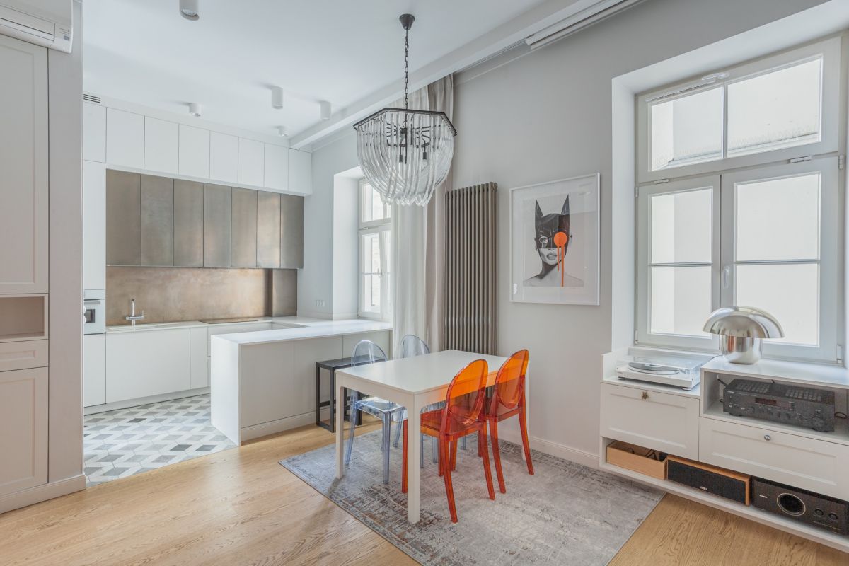 Stylowy apartament o funkcjonalnym układzie, łączący przestrzeń dzienną z wyraźnie wydzieloną strefą prywatną.