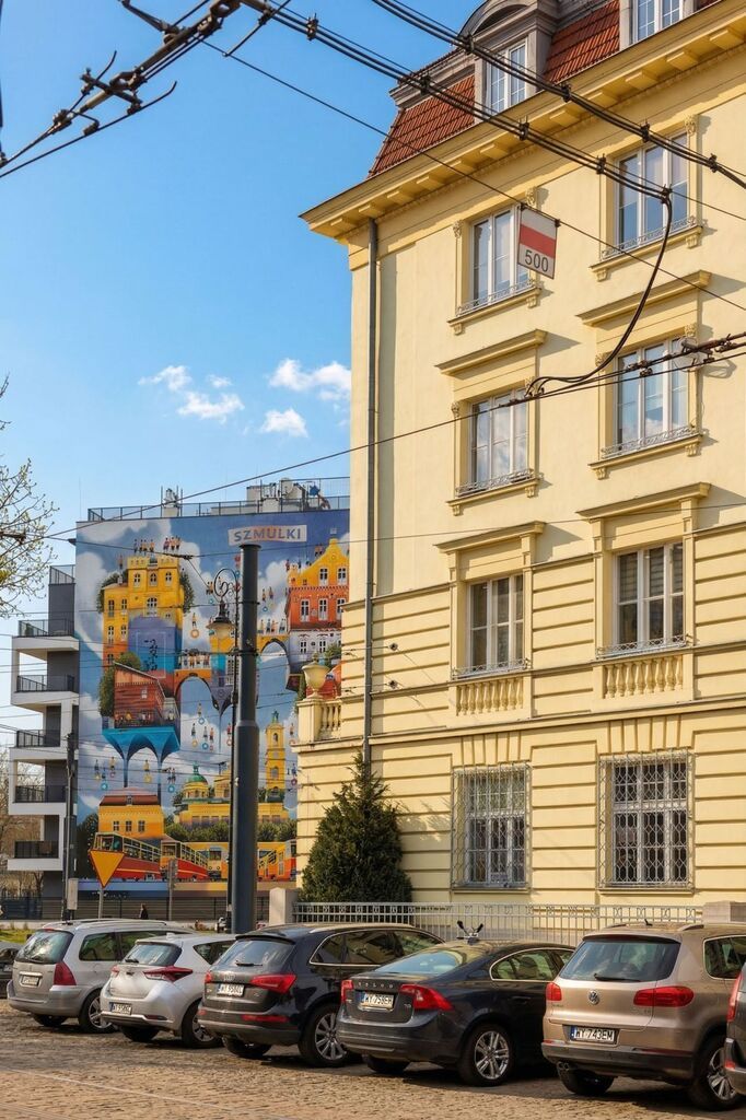 To, co wyróżnia to mieszkanie od pierwszego wejścia, to przestrzeń i klimat. Wysokość 3,3 m, duże drewniane okna i ekspozycja północno-zachodnia dają bardzo dużo światła i poczucie oddechu, którego często brakuje w nowych inwestycjach. Z okna widok na mural Szmulki Tytusa Brzozowskiego – detal, który naprawdę buduje charakter tego miejsca.