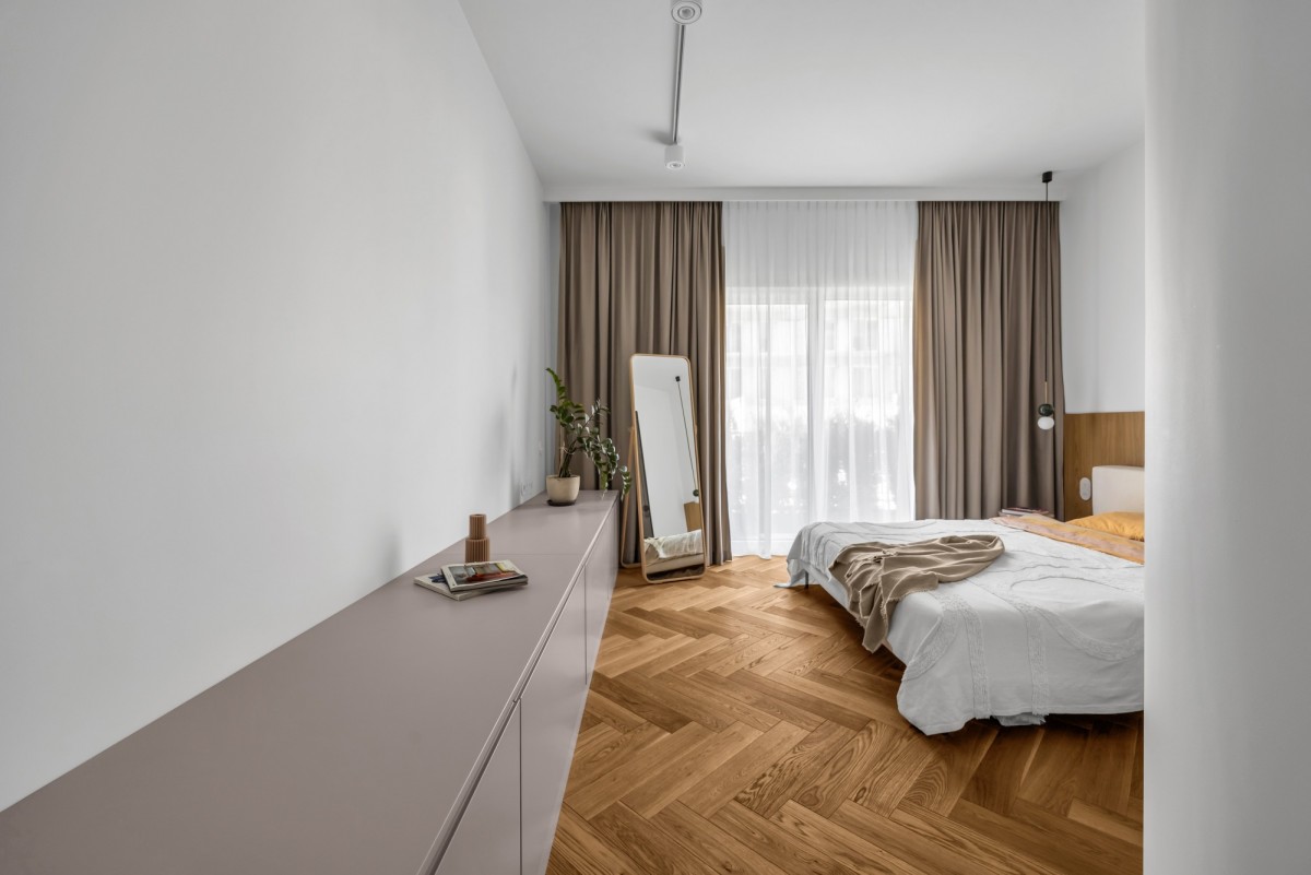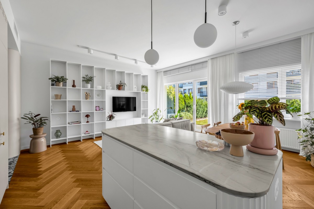 Apartament został wykończony materiałami najwyższej jakości. Na całej powierzchni apartamentu podłoga jodła klasyczna, dębowa, szczotkowana, olejowana (Home Concept) wraz z listwami przypodłogowymi na zamówienie najwyższej jakości, drzwi ukryte, lakierowane. Łazienka z prysznicem walk-in z blatem marmurowym, druga łazienka w master bedroom z wolnostojącą wanną i przeszkleniem z dostępem światła dziennego. W kuchni został wybrany kamień kwarcyt Mont Blanc- kamień naturalny klasy premium, niezwykle trwały i odporny na uszkodzenia mechaniczne.