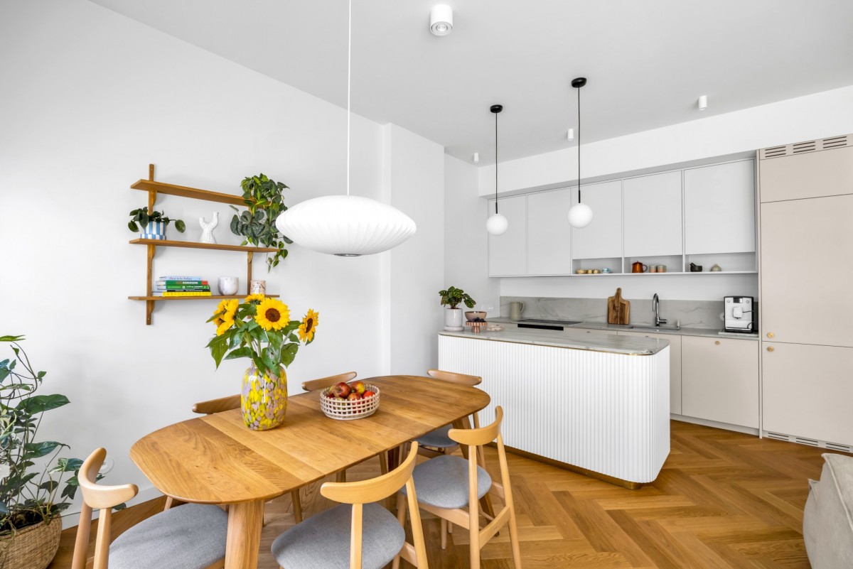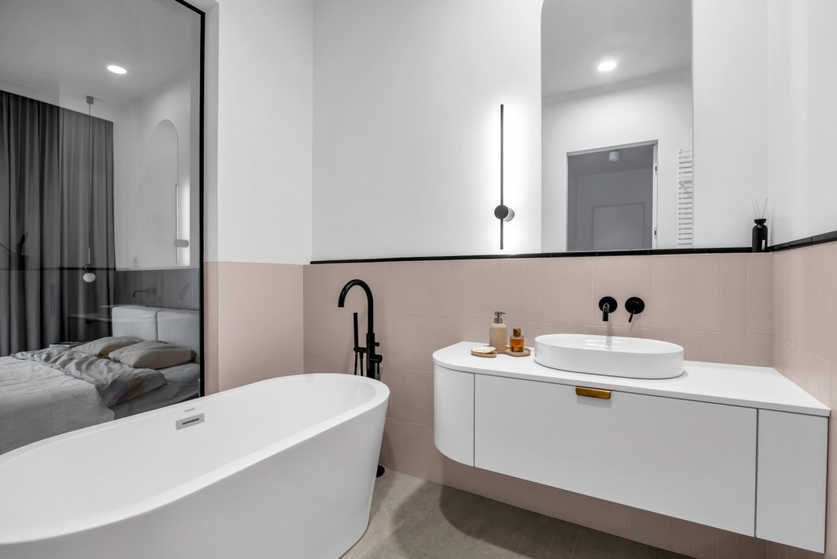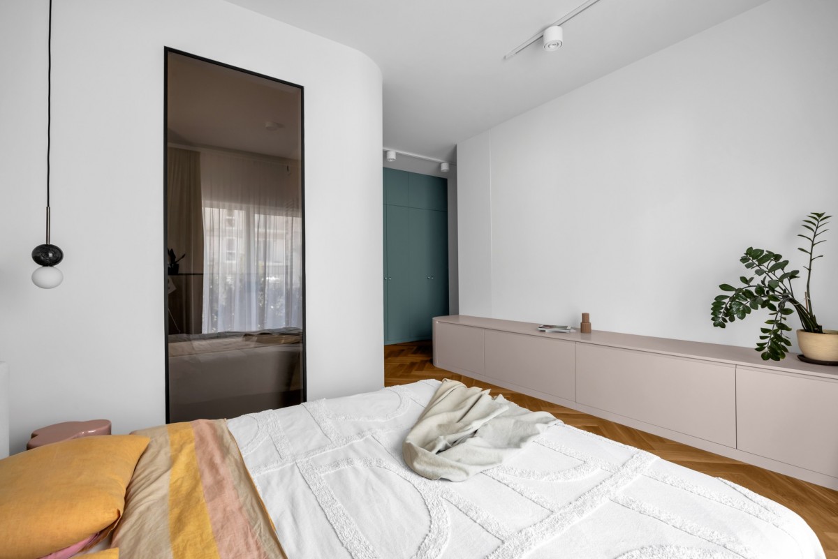 - Designerskie rozwiązania- zaoblenie ścian i zabudowy inspirowane modernistycznym stylem w nowoczesnym wydaniu,