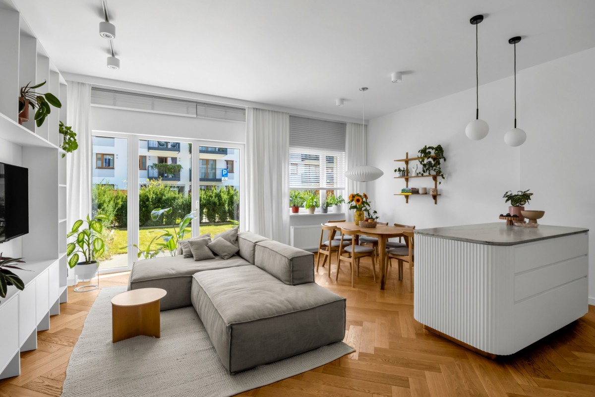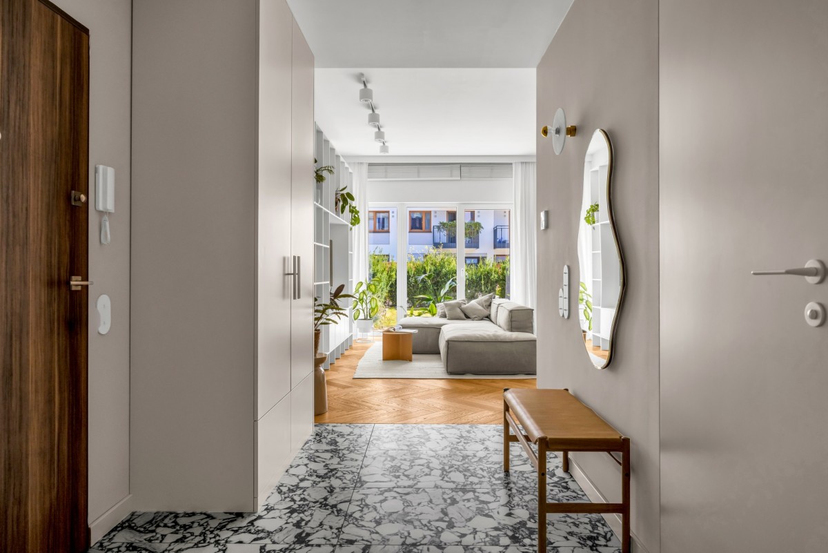 Apartament z dużymi, przestronnymi pokojami. Dwa ogródki o łącznej powierzchni 93 m2, z wyjściem na taras z 3 pomieszczeń. Ogródki obsadzone są całorocznymi cisami (krzew iglasty, zimozielony, zachowujący swoją barwę przez cały rok). Mieszkanie zaprojektowane jest w stylu współczesnego minimalizmu z elementami modernistycznymi i soft desing.