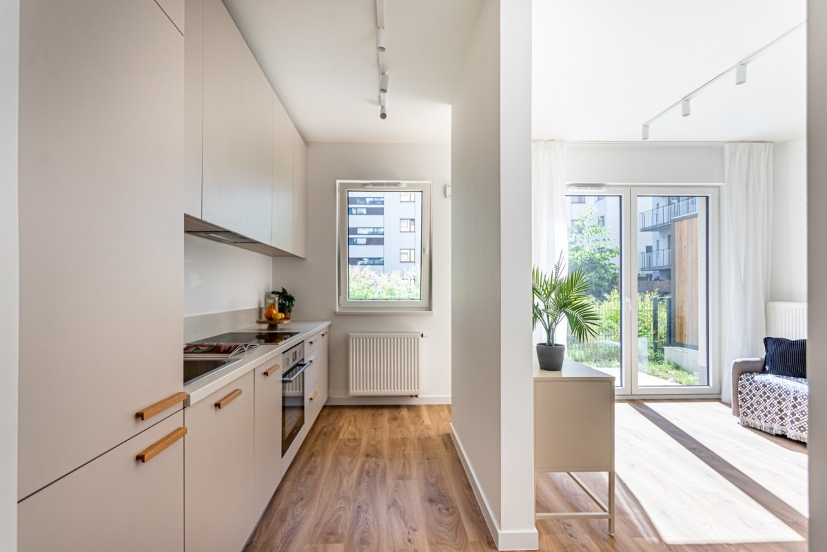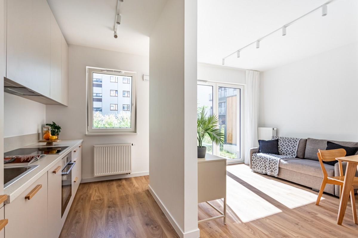 ustawny salon z aneksem kuchennym, wyposażonym w oddzielne okno, o powierzchni 19m2,