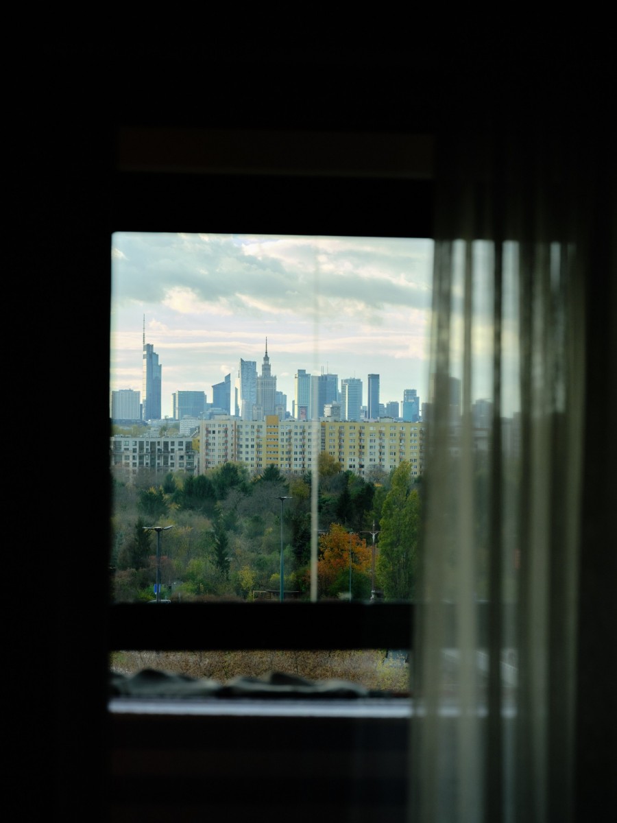 A bright loggia offers a stunning panoramic view of Warsaw.