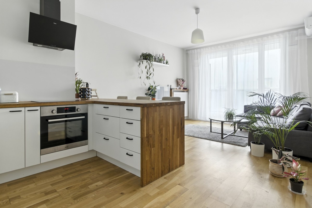 salon z aneksem kuchennym - w pełni wyposażony w sprzęt AGD (zmywarka, piekarnik, płyta indukcyjna, lodówka),