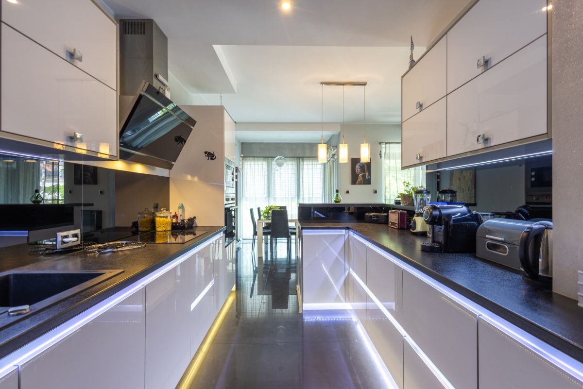 Biała zabudowa kuchenna na wysoki połysk, z dożywotnią gwarancją mebli, funkcją cichego domyku, licznym oświetleniem ledowym i z wysokiej klasy sprzętem AGD