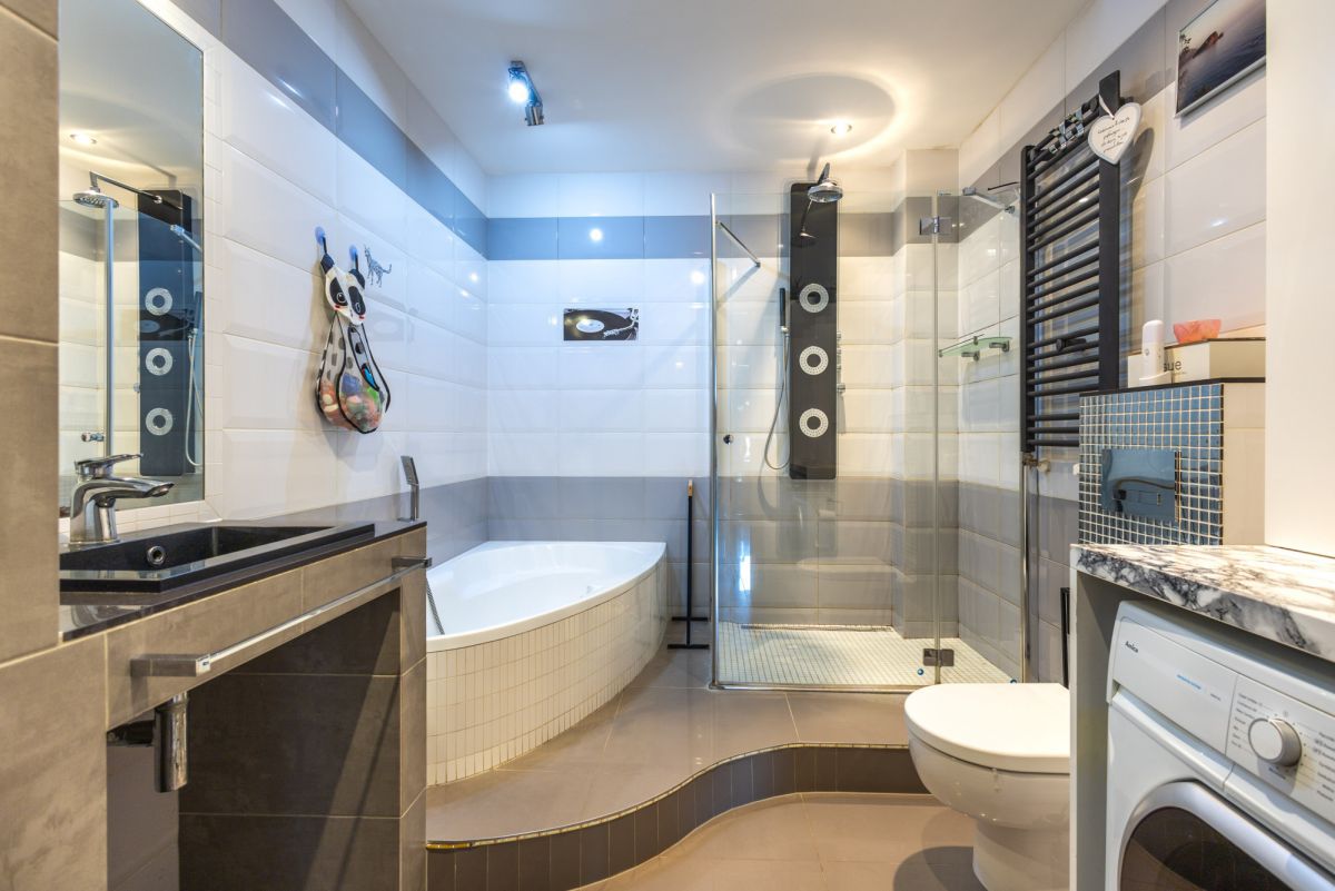 Dużo formatowe płytki na wysoki połysk w odcieniach czerni, szarości oraz bieli, wysokiej klasy panele podłogowe oraz wykładziny w 2 pokojach