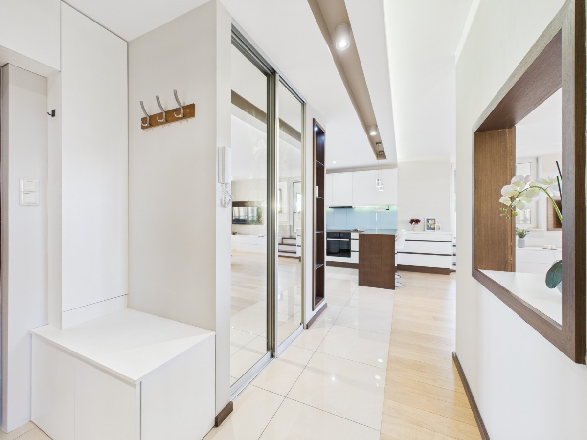 Atutem nieruchomości jest prywatny, kameralny i słoneczny taras (12,2 m2) oraz przeszklony ogród zimowy (6,76 m2), z których rozciąga się piękny widok na Warszawę - idealne miejsce na odpoczynek, pracę czy spotkania ze znajomymi.