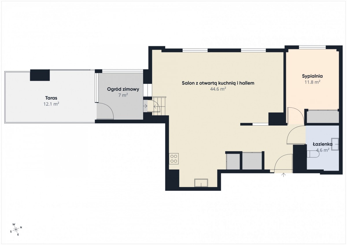- jasny salon z otwartą kuchnią i wyjściem do ogrodu zimowego oraz na taras (38,77 m2),