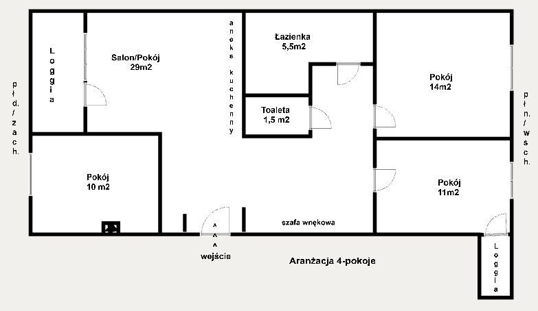 - dwa oddzielne pokoje (ok. 14 m² i 11 m²), przy czym mniejszy pokój posiada wyjście na drugą zabudowaną loggię;