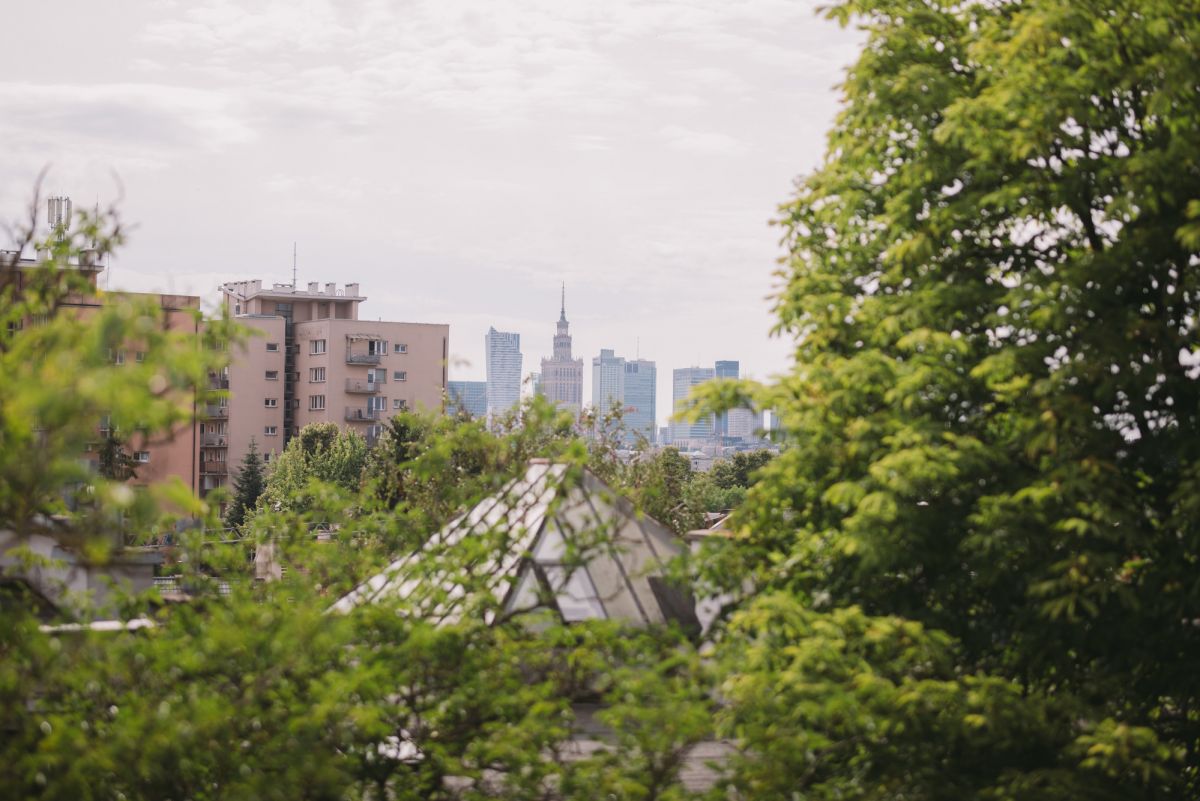 Z balkonu roztacza się przepiękny widok na panoramę Warszawy, w tym na Pałac Kultury i Nauki oraz okoliczny starodrzew - to idealna przestrzeń na poranną kawę lub spokojny wieczór z lampką wina.