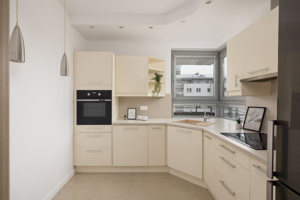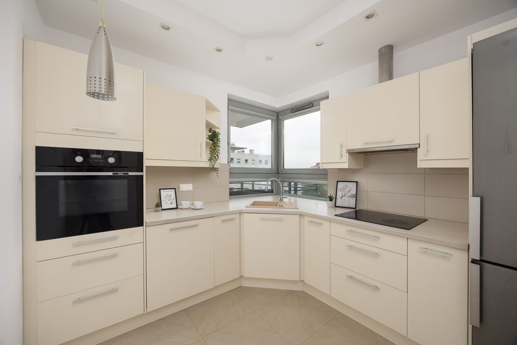 Kuchnia została zaprojektowana na wymiar i wyposażona w pełne AGD: zmywarkę, lodówkę z zamrażarką, płytę indukcyjną, piekarnik oraz okap. Narożne okno doświetla przestrzeń i dodaje jej lekkości. Dodatkowo zmieścił się tu również stolik jadalniany z krzesłami.