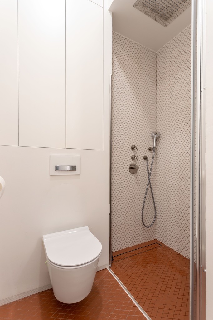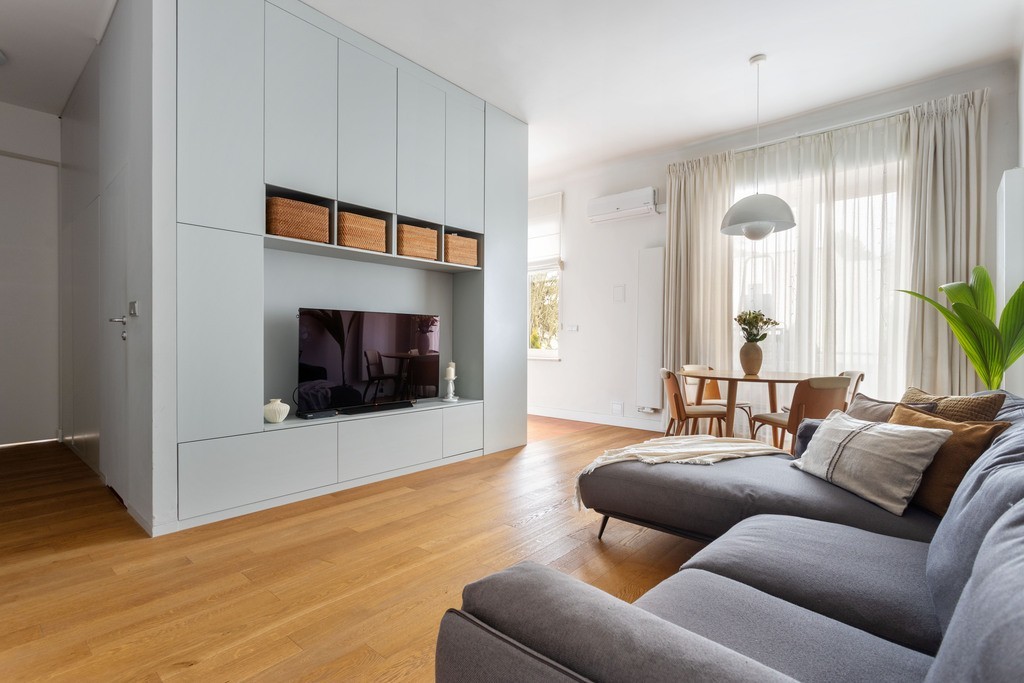 The apartment has undergone a complete renovation , boasting new plumbing, air conditioning, flooring, and a modern bathroom. The kitchenette, living room units, wardrobes, and hallway furniture are all custom-designed.