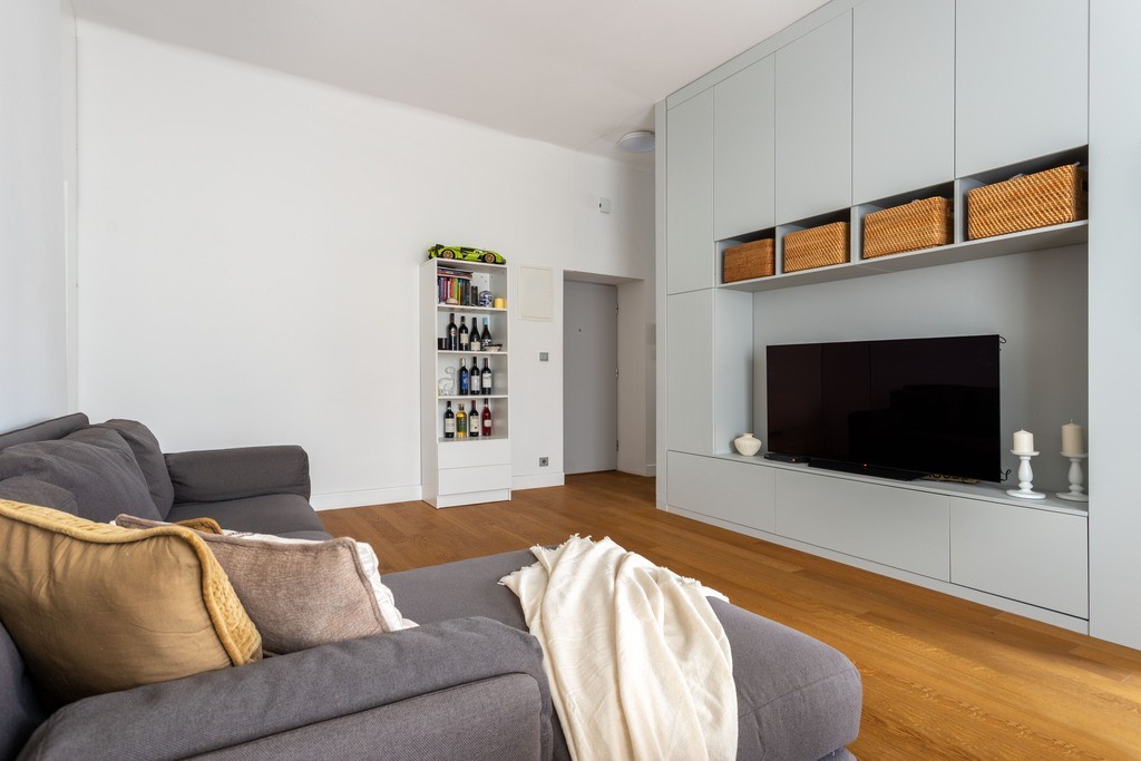 Mieszkanie przeszło generalny remont – ma nowe instalacje, klimatyzację, podłogi oraz nowoczesną łazienkę. Aneks kuchenny, zabudowa salonu, szafy oraz meble w holu zaprojektowano na wymiar.