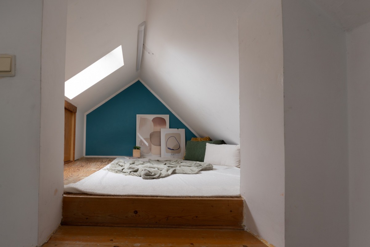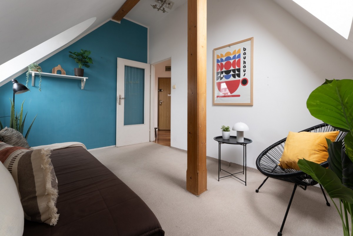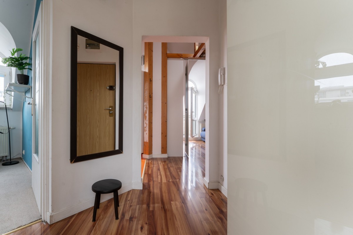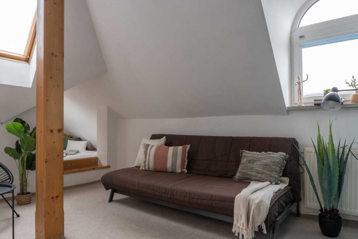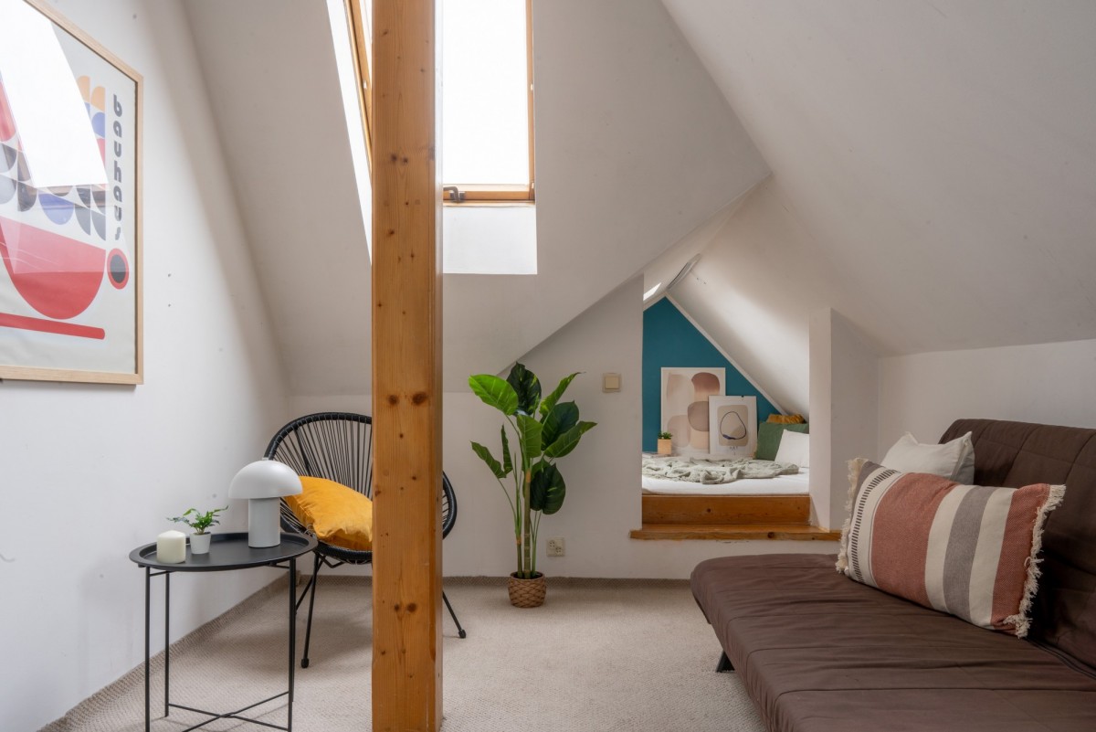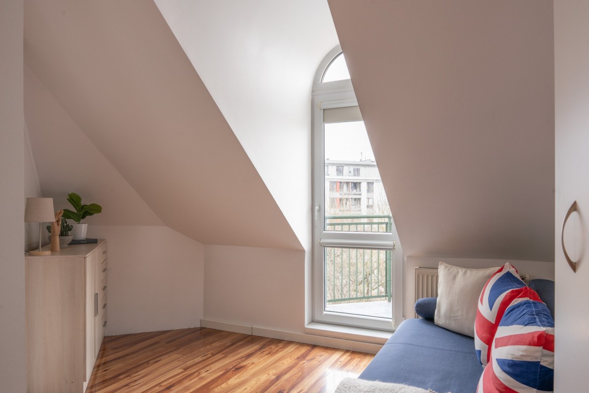 Połaciowe okna wnoszą do wnętrza dużo naturalnego światła, czyniąc miejsce klimatycznym i przytulnym, a dzięki położeniu na 4. piętrze (z 4., bez windy) miejsce to jest niezwykle ciche i intymne - tu naprawdę odpoczniesz. A gdy zapragniesz świeżego powietrza, do Twojej dyspozycji jest balkon idealny na popołudniową kawę.