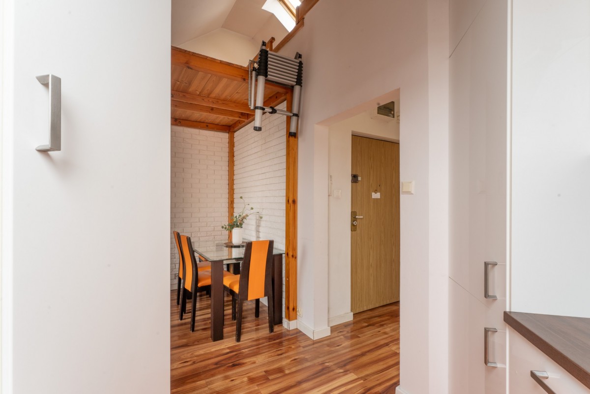 Nietuzinkowe mieszkanie na poddaszu przy ul. Prochowej 28 - jasne, ciche, pełne zakamarków, skosów i drewnianych belek tworzących wyjątkowy klimat. To miejsce, jakiego próżno szukać w standardowych blokach, a mimo pozornie małego metrażu - 32,55 m2 (mierzone po podłodze ok. 45 m2) w rzeczywistości daje zaskakująco dużo przestrzeni do wygodnego życia. Jeżeli szukasz czegoś niepowtarzalnego, to musisz je zobaczyć - takie mieszkania to rzadkość!