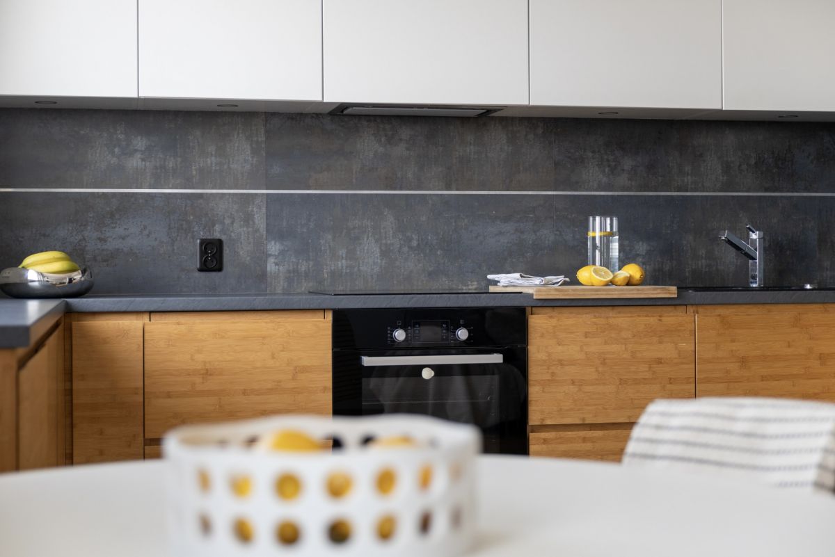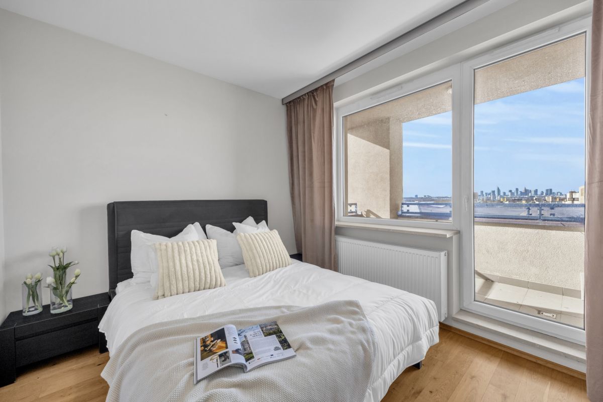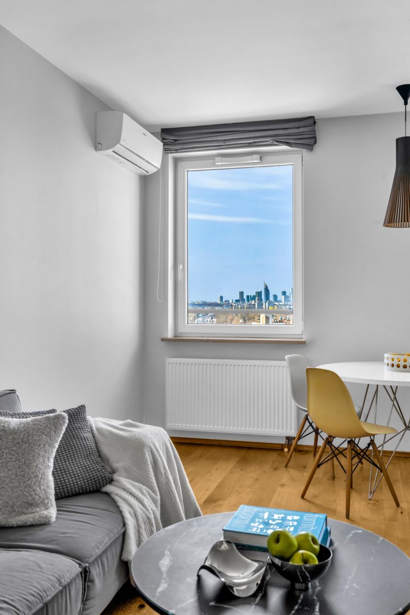 - Salon z otwartą kuchnią - otwarta, słoneczna przestrzeń z dużymi oknami, wyposażona w klimatyzację. Roztacza się stąd niesamowity widok na południowo-zachodnią część Warszawy, w tym Stadion Narodowy oraz pełną panoramę wieżowców w Śródmieściu (Skyline).