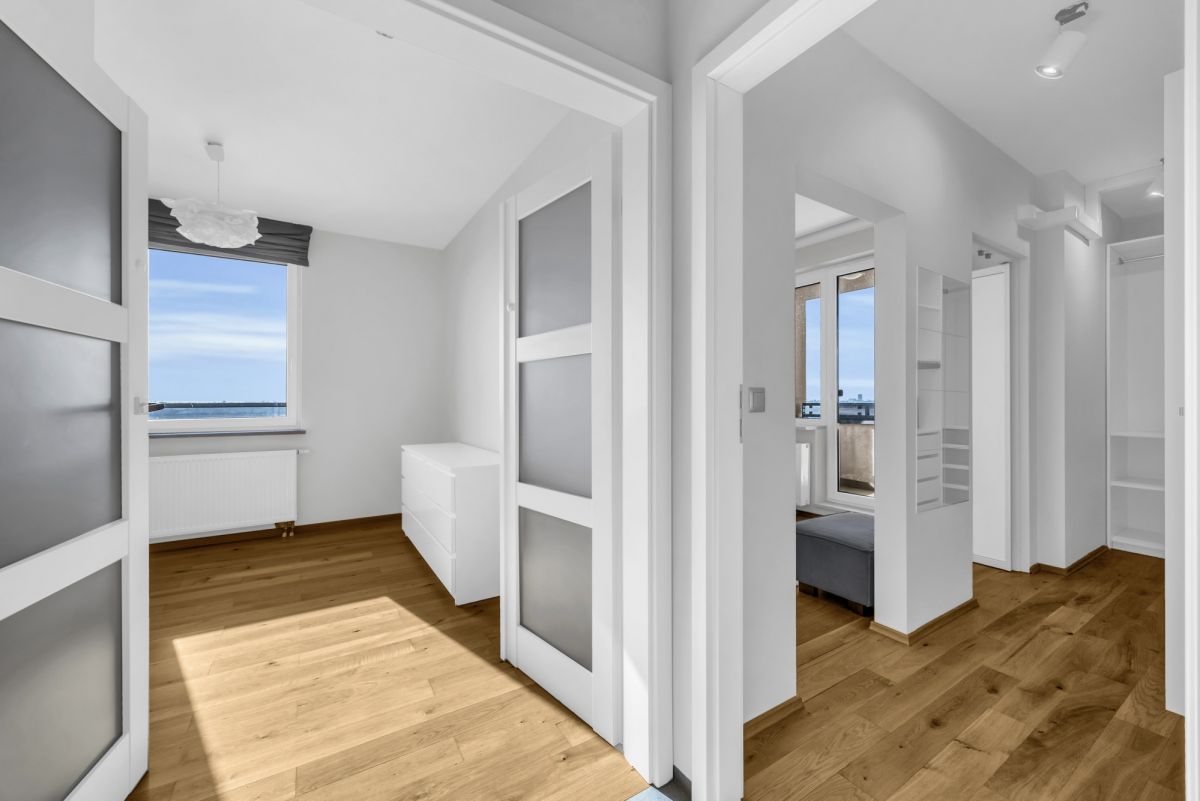 - Druga sypialnia - mniejszy pokój, doskonały jako sypialnia gościnna, dziecięca lub gabinet. Okna wychodzą tu na południowy wschód, oferując kojący widok na Wisłę i Most Siekierkowski.
