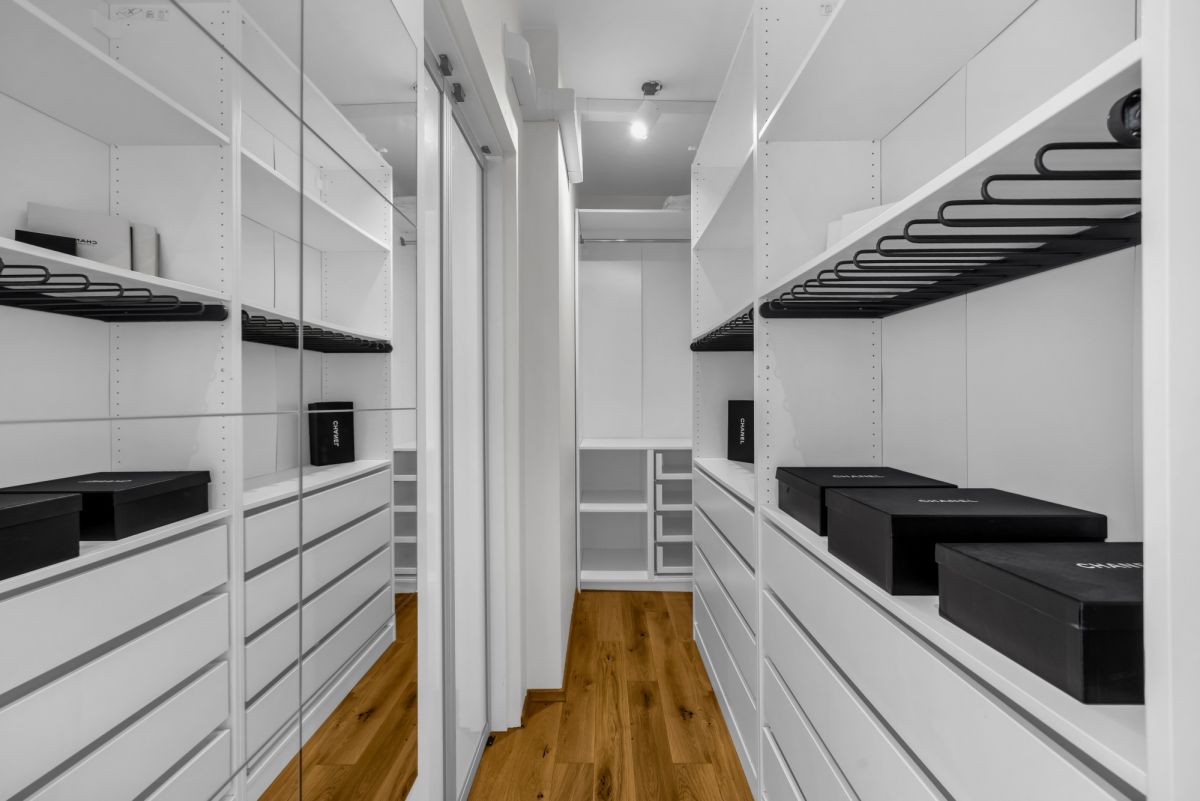 - Sypialnia główna - przestronna, klimatyzowana i ustawna, oferująca ten sam imponujący widok na centrum miasta. Posiada bezpośrednie wyjście na loggię - idealne miejsce na poranną kawę z widokiem na panoramę miasta oraz Wisłę. Istnieje możliwość jej zabudowy. Do sypialni przylega duża, prywatna garderoba.