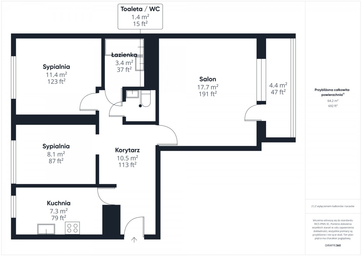 Metraż: 61 m2 + piwnica ok. 1,5 m2 + balkon