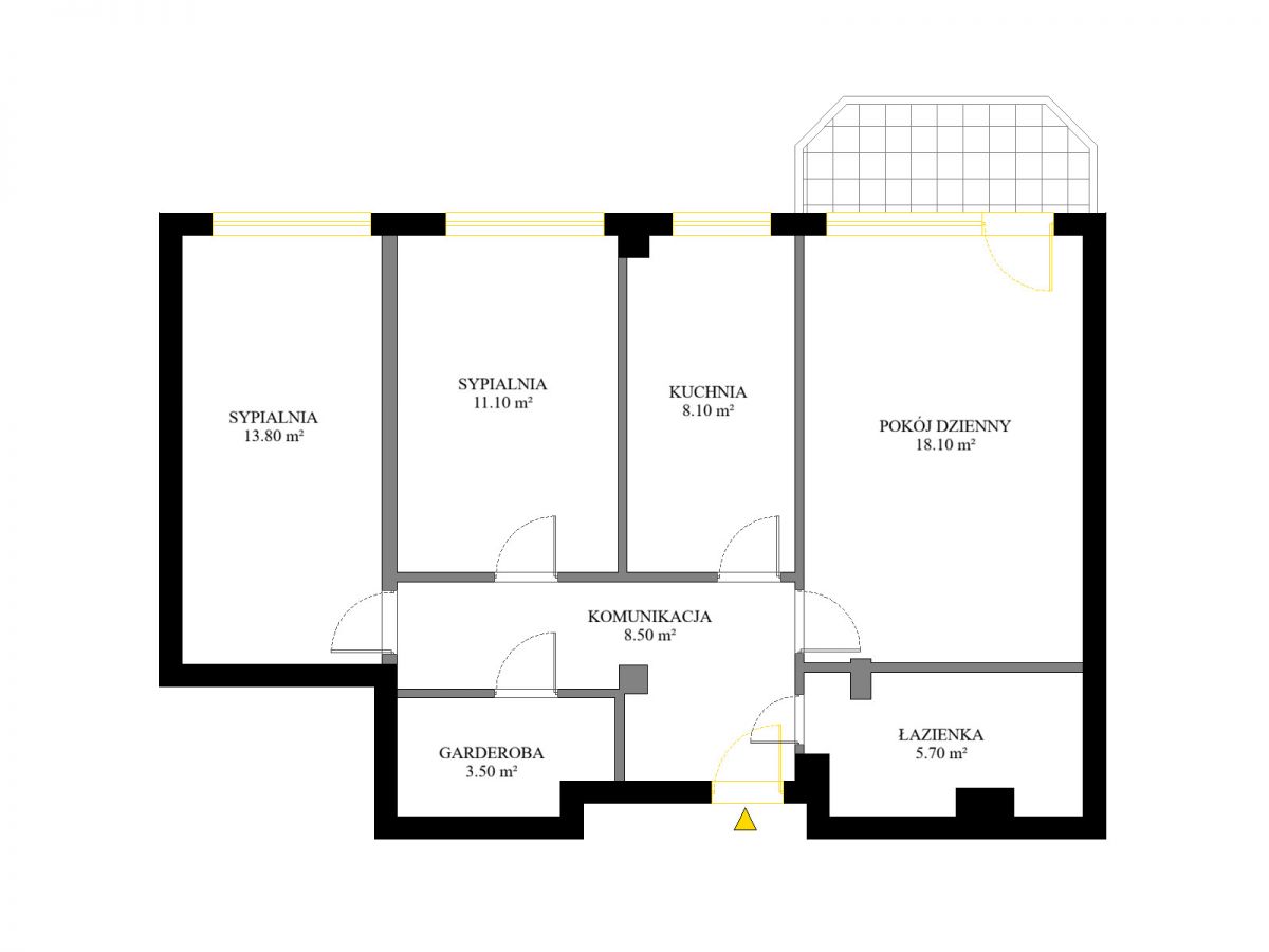 Mieszkanie ma przemyślany rozkład i dobrze wykorzystany metraż. Sercem jest salon o powierzchni 18,10 m². To właśnie stąd wychodzisz na balkon, który naturalnie przedłuża strefę dzienną. Dwie sypialnie mają 13,8 m² oraz 11,1 m². Taki układ daje komfort parze, rodzinie albo osobom pracującym z domu. Możesz też łatwo rozdzielić funkcje: sypialnia, pokój dziecka, gabinet lub pokój gościnny.