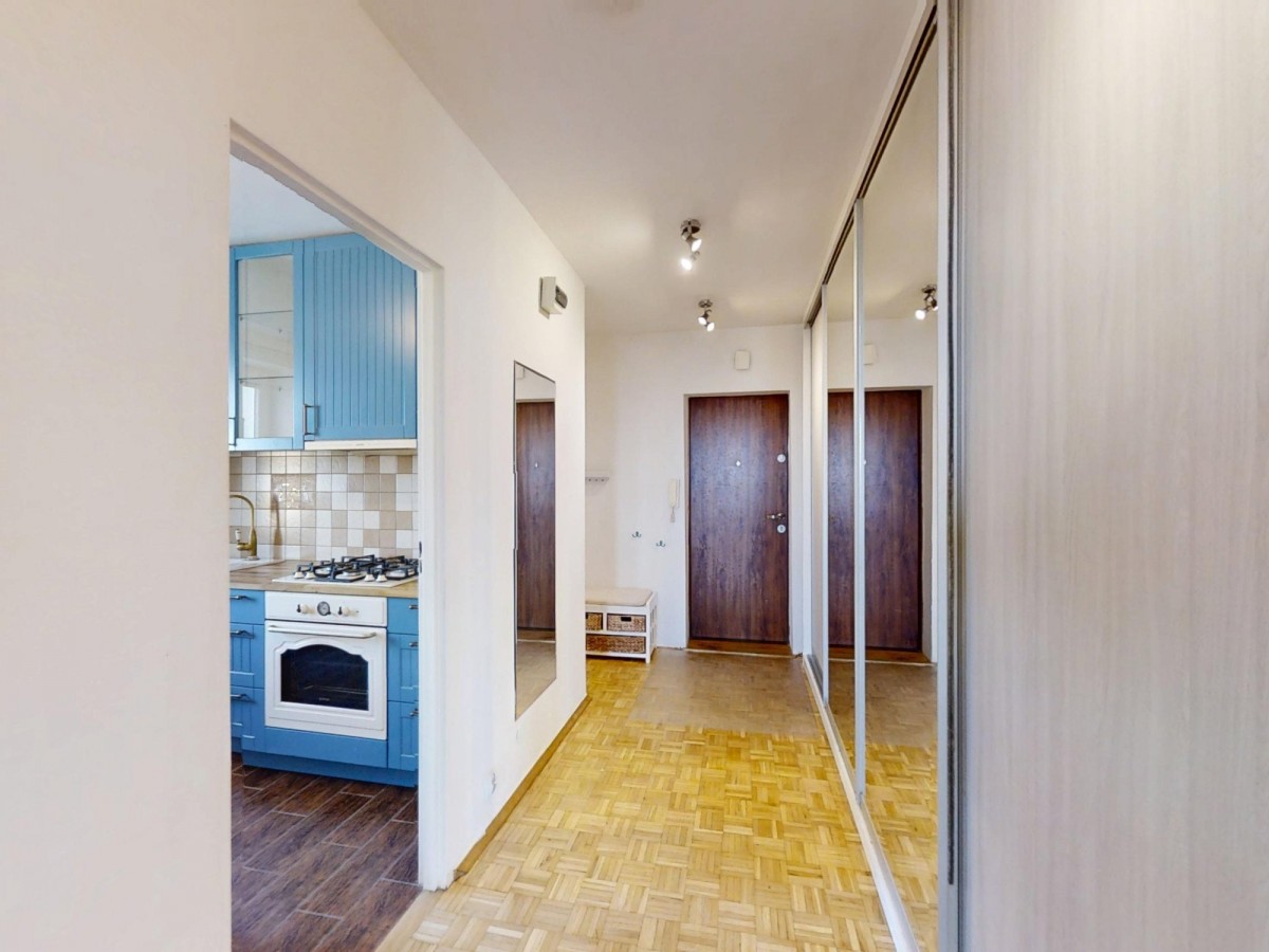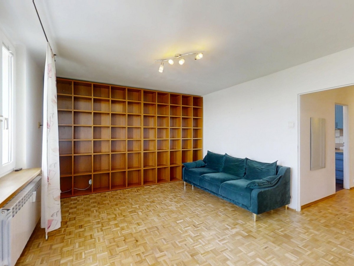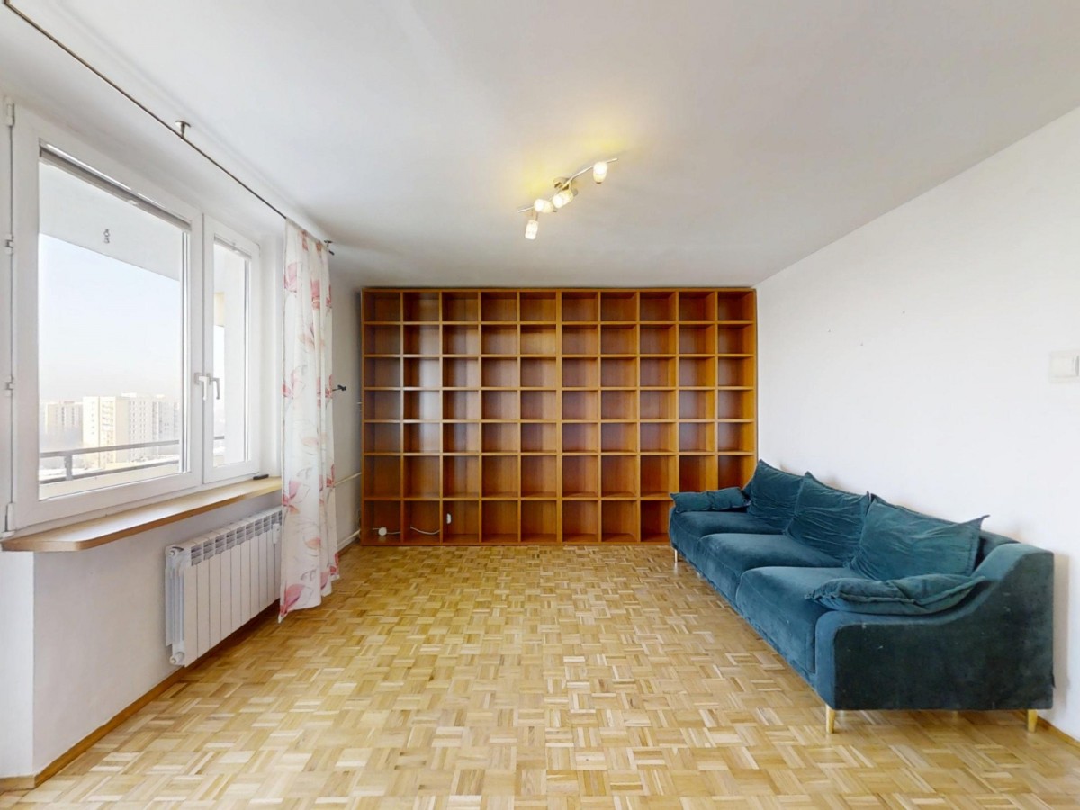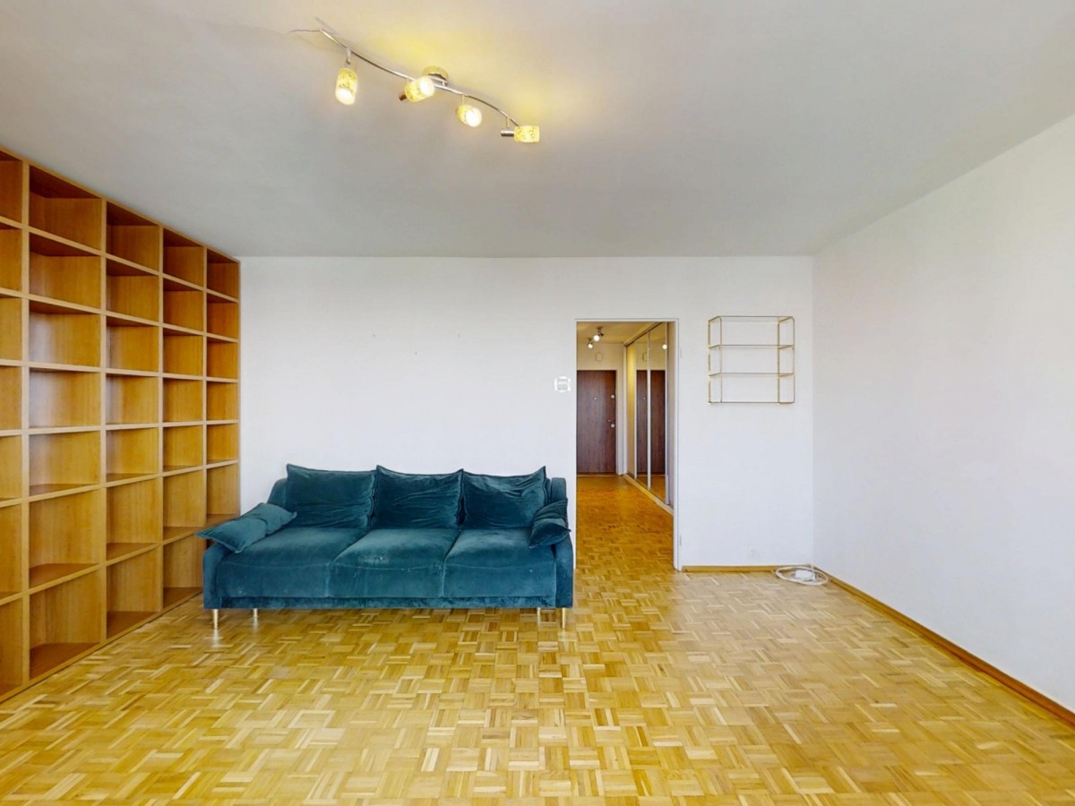 - słonecznego salonu z wyjściem na duży balkon i widokiem na centrum Warszawy