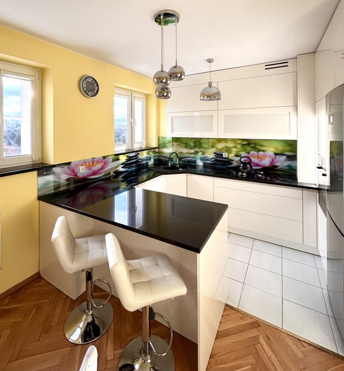 Kuchnia z jadalnią - powierzchnia ok 14,8m2 - po remoncie, z półwyspą i dwoma hokerami, meble i sprzęt AGD w cenie mieszkania.