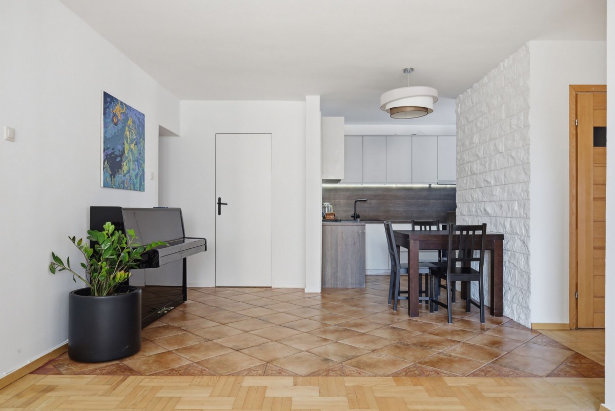 Strefa dzienna została zaprojektowana w formie salonu połączonego z otwartą kuchnią, co daje dużą, jasną przestrzeń do codziennego życia i spotkań. Dodatkowym atutem jest okno w kuchni, które zapewnia naturalne doświetlenie tej części mieszkania.