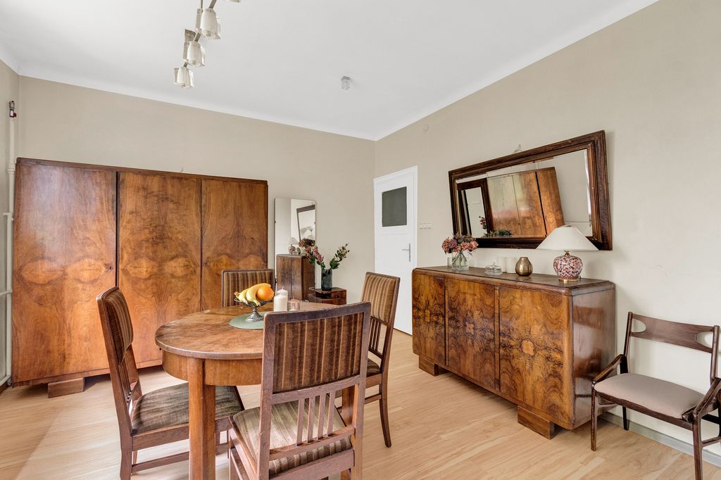 The apartment features a spacious living room of approximately 23 m², easily accommodating both a relaxation area and a workspace. A large window overlooks greenery, and the 2.73 m ceiling height provides the sense of space typical of pre-war tenement buildings.