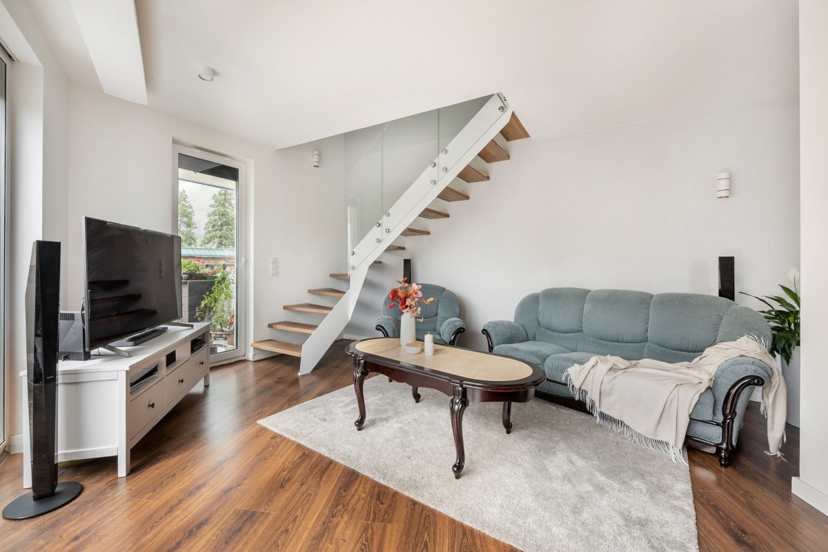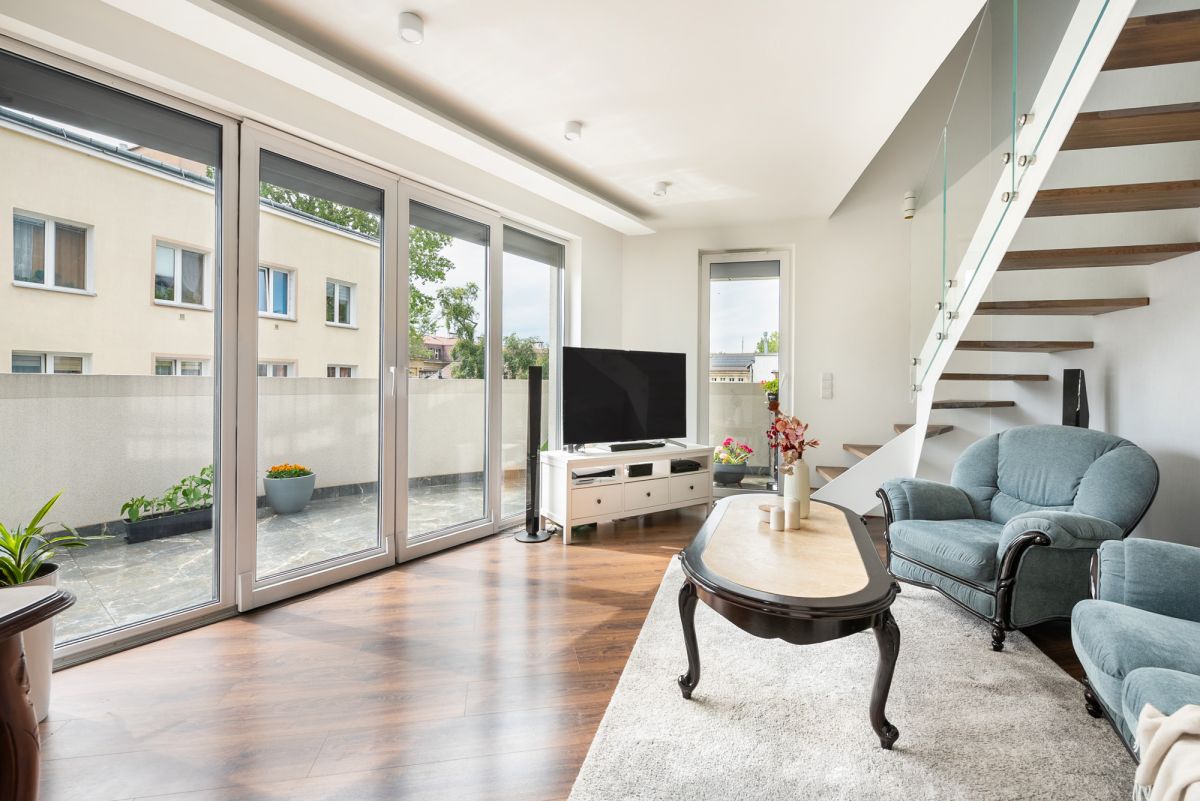 Wyjątkowym atutem lokalu jest przepiękny taras o powierzchni 15,86 m2. Dodatkowo na drugim poziomie znajduje się balkon 3,75 m2 - przyległy do sypialni.