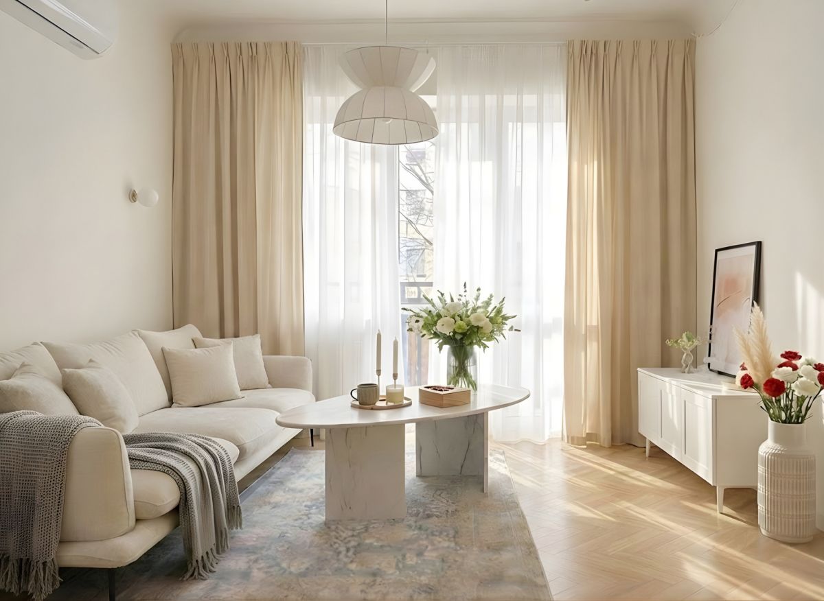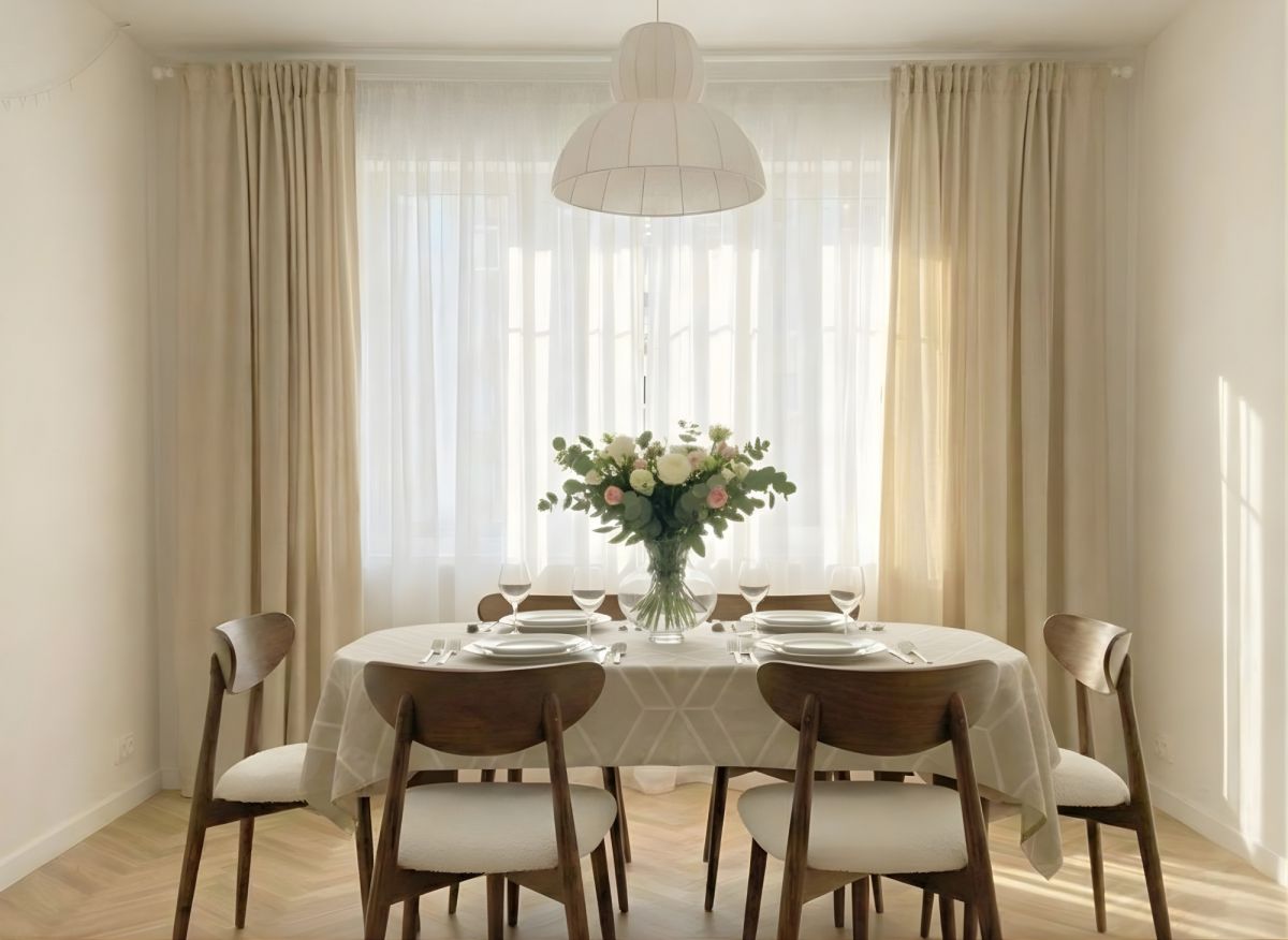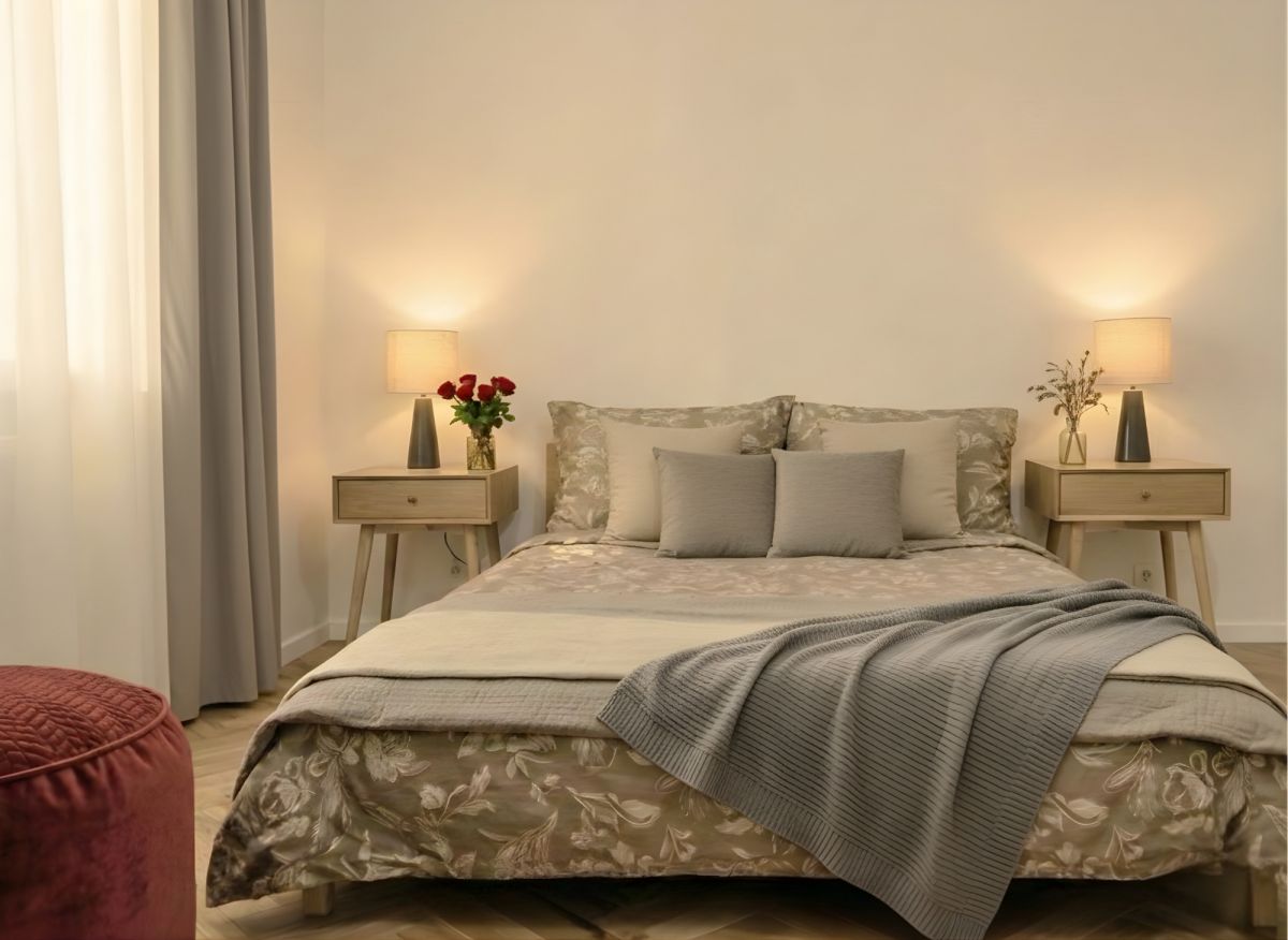 Wnętrze utrzymane jest w jasnej, ciepłej kolorystyce z naturalnymi akcentami.