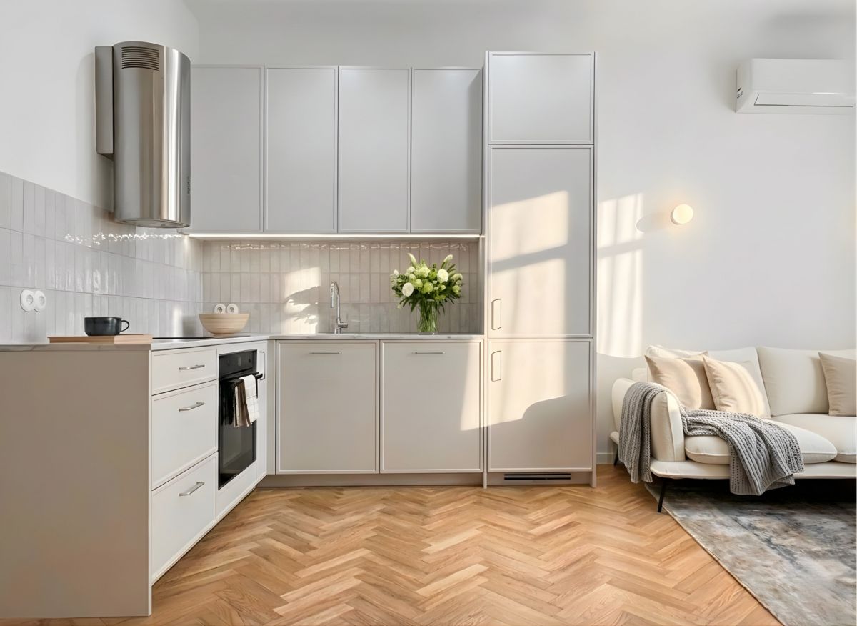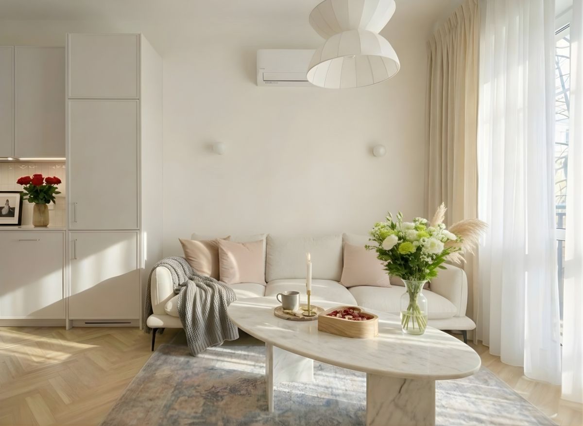 Duże przeszklenia, słoneczna ekspozycja i wyjście na balkon sprawiają, że strefa dzienna jest naturalnie doświetlona przez cały dzień. Komfort uzupełnia klimatyzacja, która realnie podnosi jakość życia na co dzień.