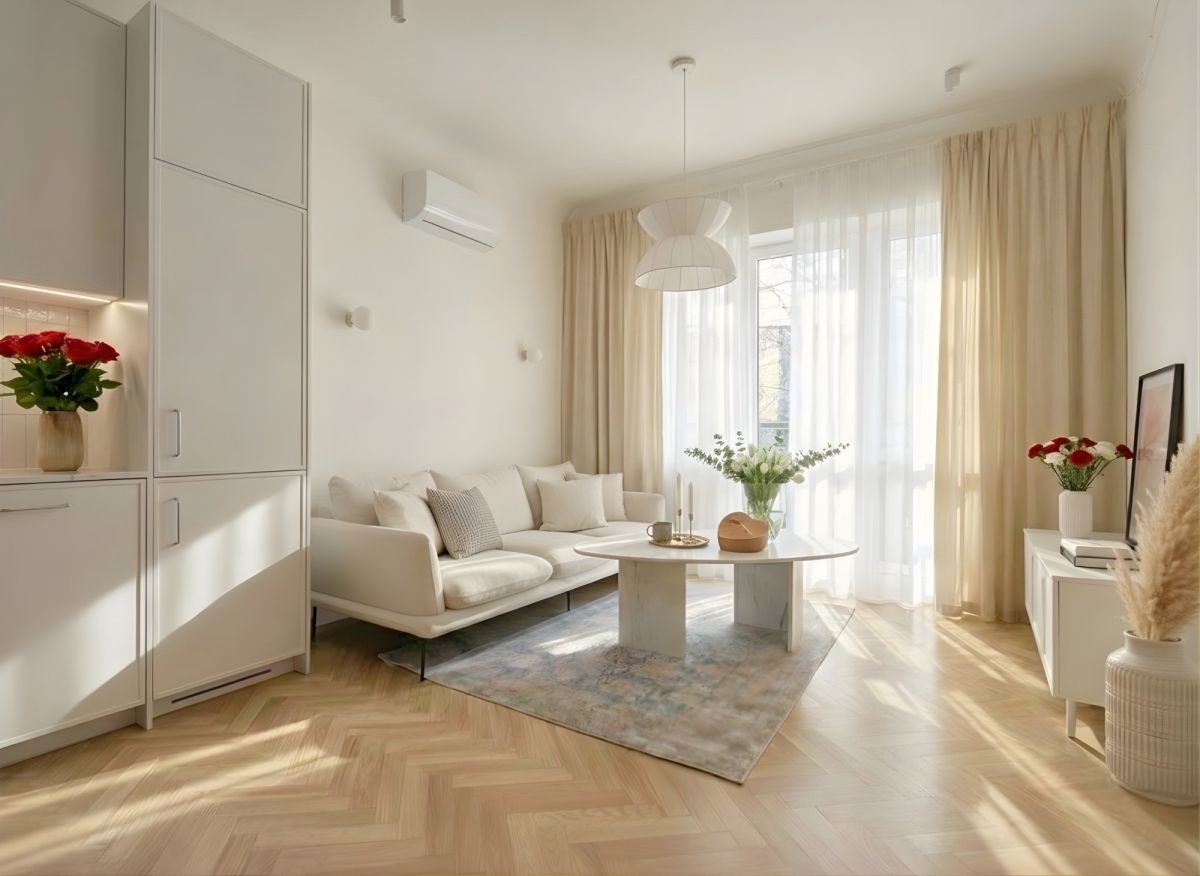 W "tej prawdziwej" Saskiej Kępie znajduje się mieszkanie, które - mimo kompaktowego metrażu - oferuje przestrzeń, światło i funkcjonalność na poziomie znacznie większych lokali.