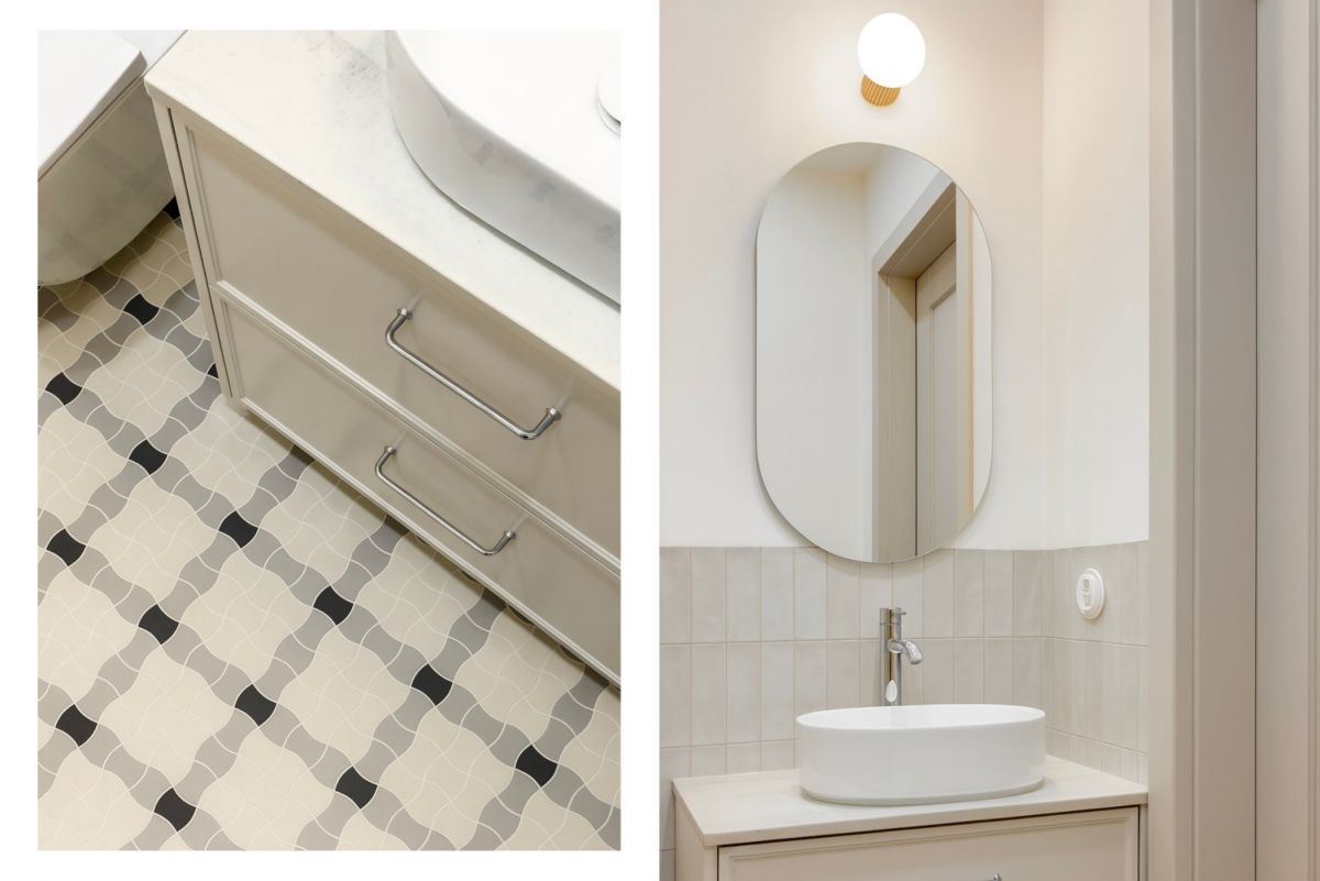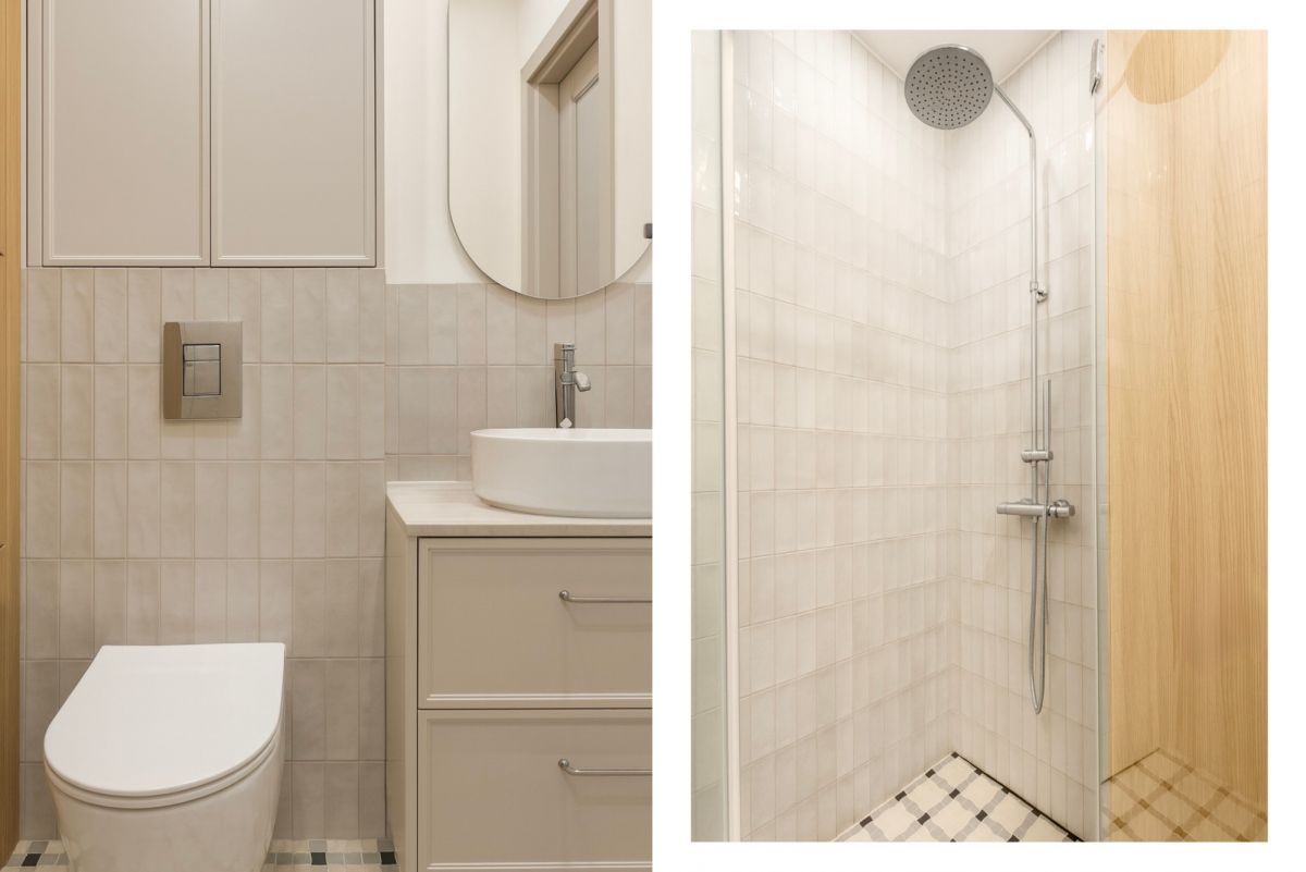 Na uwagę zasługuje łazienka - z wykorzystaniem warszawskiej mozaiki w nowoczesnym wydaniu, co daje subtelne nawiązanie do miejskiego charakteru i wyróżnia to wnętrze na tle innych.