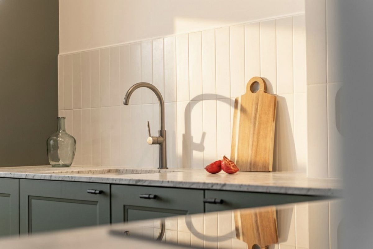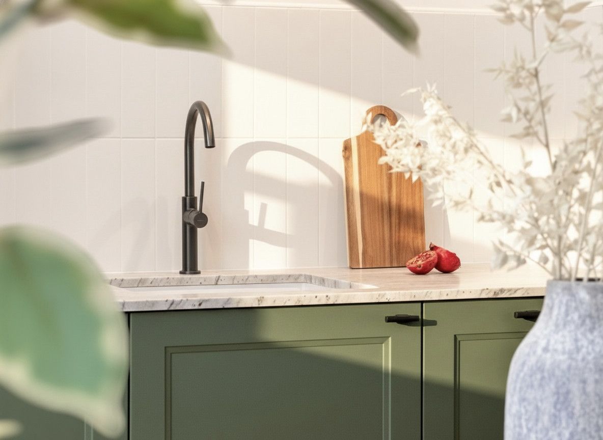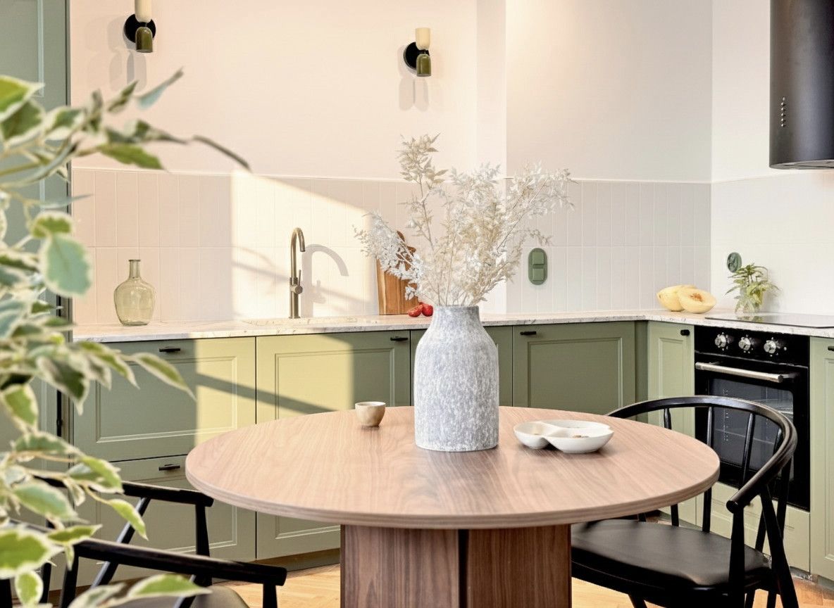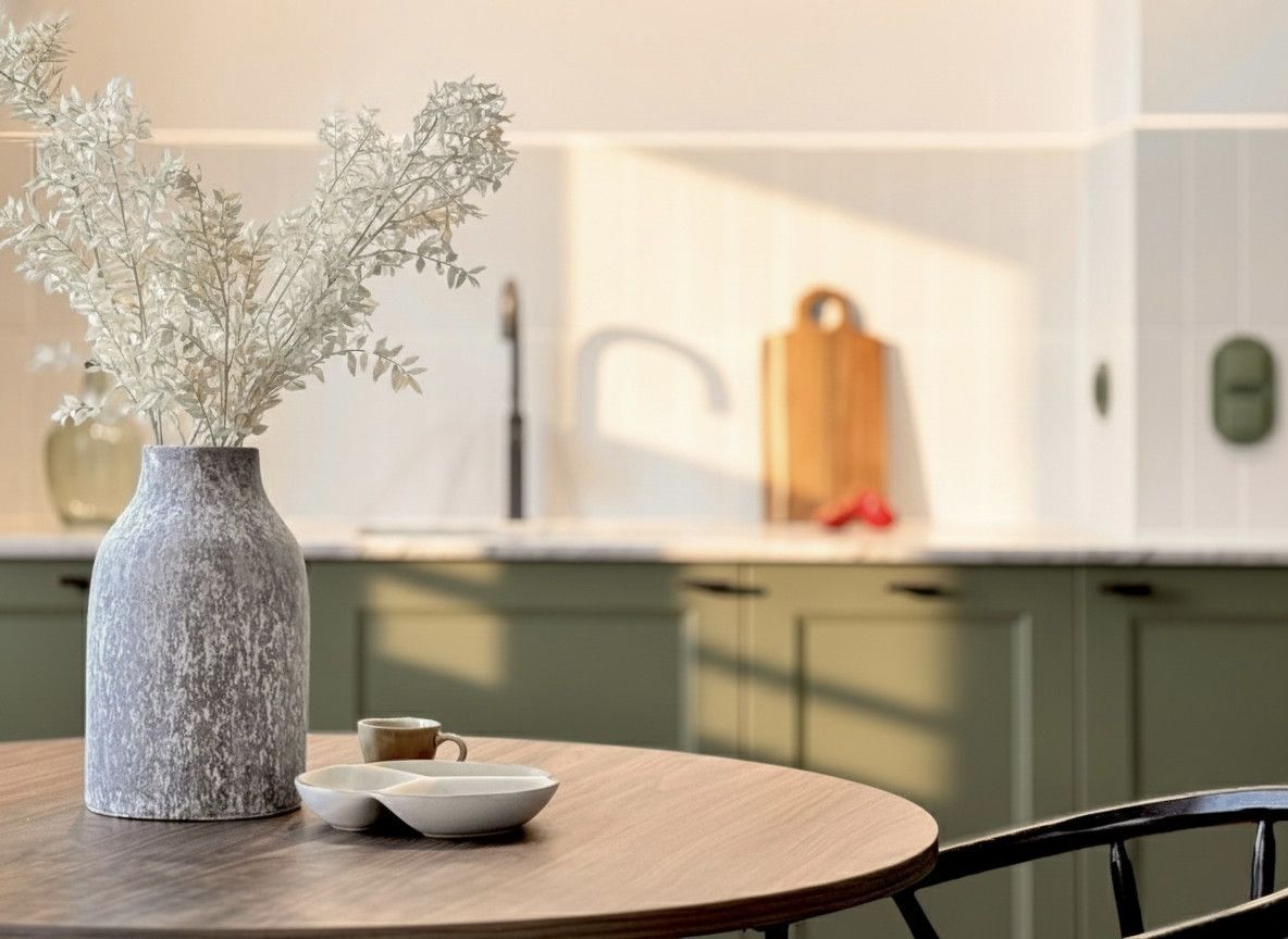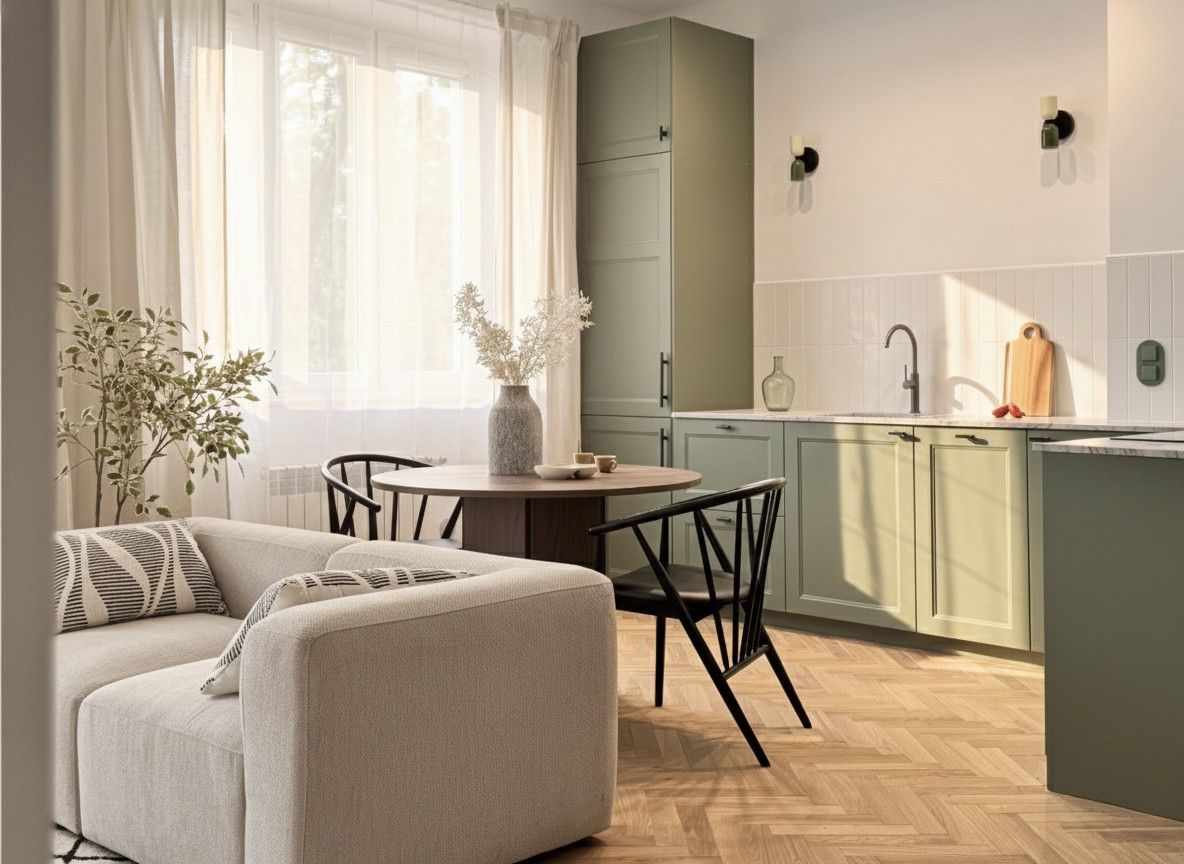 Dębowy parkiet w klasyczną jodełkę, zabudowy stolarskie na wymiar w odcieniach oliwkowej zieleni oraz naturalna, stonowana paleta barw tworzą wnętrze spokojne, eleganckie i ponadczasowe.